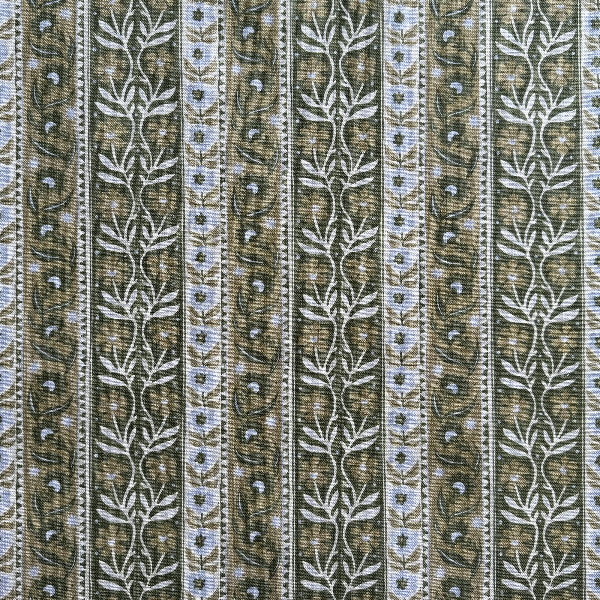 A take on the classic stripe. The hand painted floral design wriggles vertically down the fabric. Made of four colours with soft geometric details, a really versatile design.