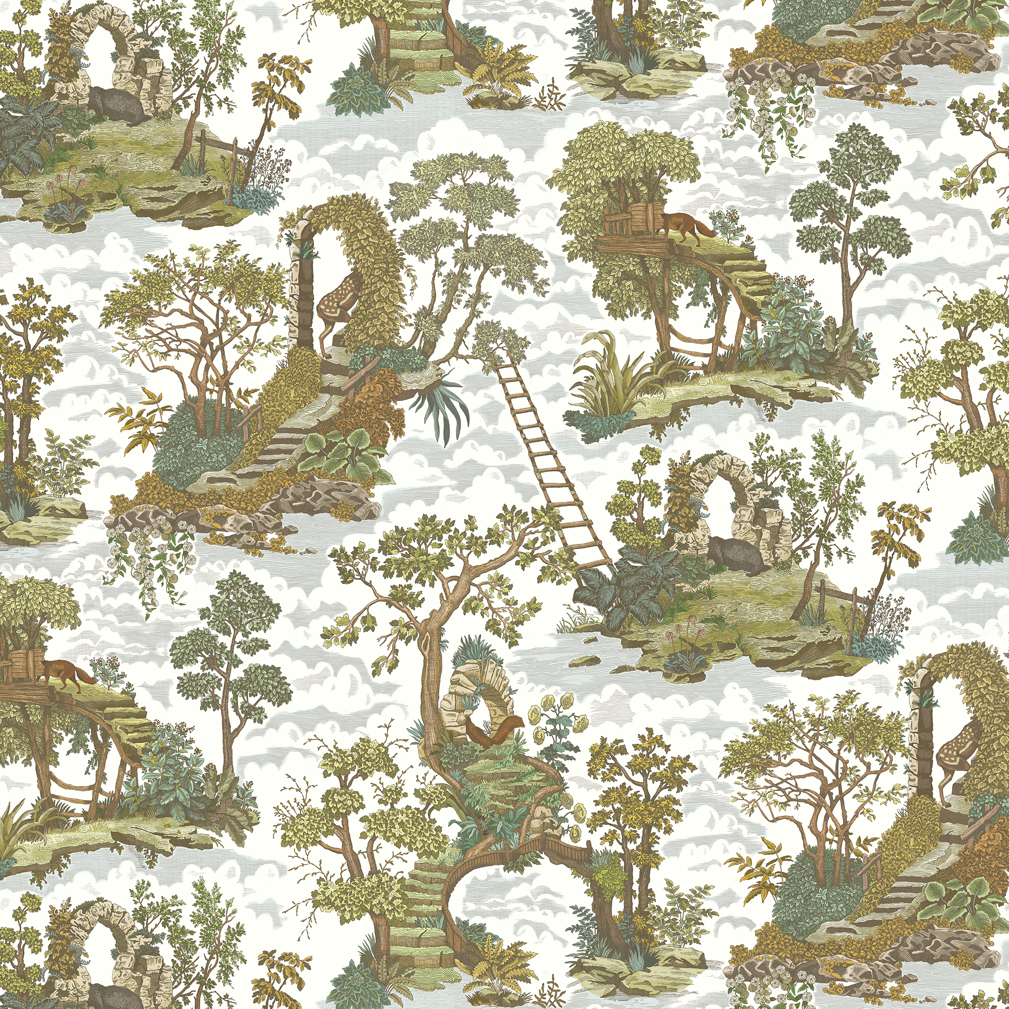 An enchanted woodland drawn in pen by Josephine. These fantastical trees and animals come in two colour ways bringing joy to any room. This design is also available in a more simple version called Islet hopping toile.