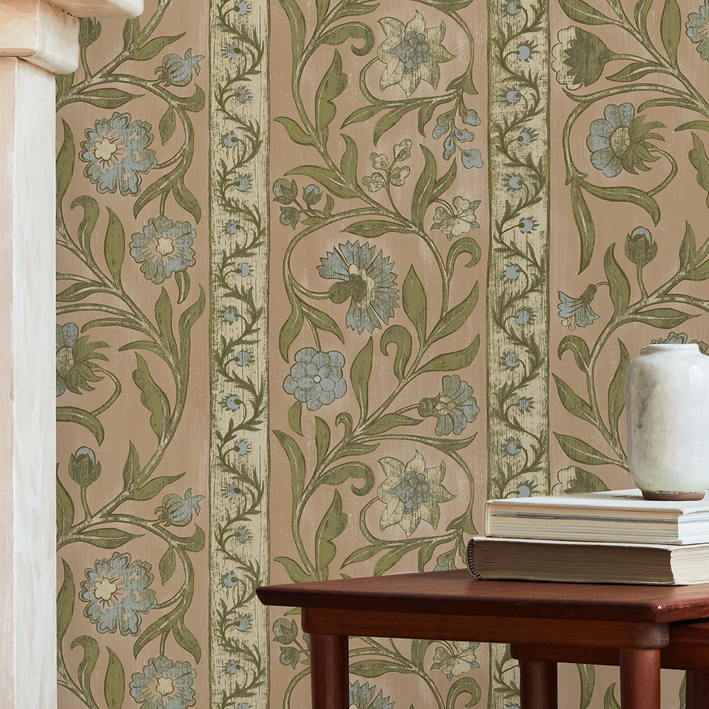 Potter stripe is a floral stripe design inspired by the delicate motifs found on traditional ceramics. Hand-Painted motifs found on traditional ceramics. Hand Painted flowers in structured vertical repeats. Painted onto wood and sanded to give a beautiful texture. Available in five carefully curated coourways.