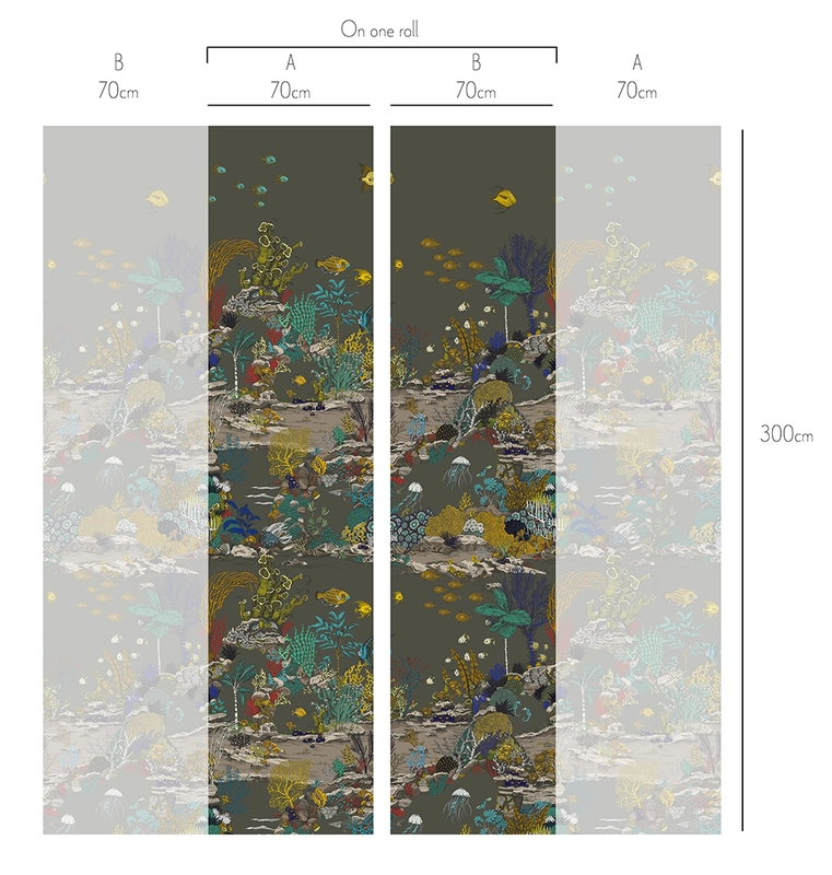 A wallpaper design that was inspired by a trip to Belize. Underwater and on-shore vegetation blurred into one. As my drawings progressed, this magical underwater jungle slowly appeared. Multi coloured with lots of detail, this tall panel can bring character to any room.