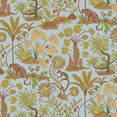 Floating islands drift beneath palms laden with fruit, where jaguars, chameleons and birds wander through lush foliage. A naïve composition with a gentle rhythm, Paradisum captures the wonder of an imagined landscape. Printed on a 70cm wide roll and available in three colourways. Printed on a 70cm wide roll and available in three carefully balanced colourways, this design captures the charm of hand-drawn artistry with a refined, timeless finish.