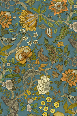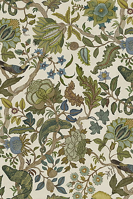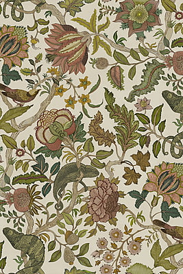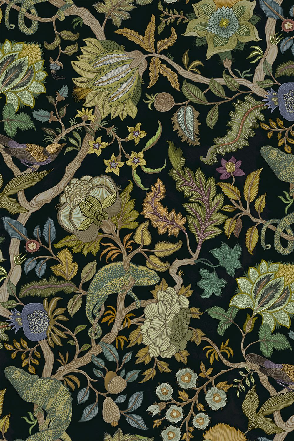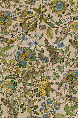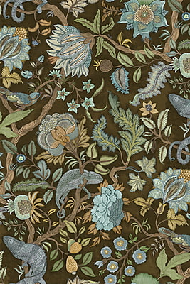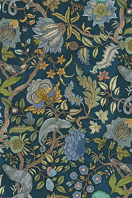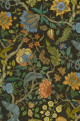 Chameleon Trail depicts an amusing take on a traditional floral trail. This exuberant tree of life comprises of a leafy stem with chameleons perching and sprawling stylised flowers. This design took Josephine a month to paint and colour.