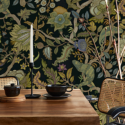 Chameleon Trail depicts an amusing take on a traditional floral trail. This exuberant tree of life comprises of a leafy stem with chameleons perching and sprawling stylised flowers. This design took Josephine a month to paint and colour.