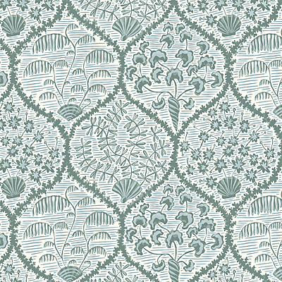 This design is inspired by antique botanical prints. An ogee shape brings the design together with different foliage appearing out of shell shapes. All hand painted by Josephine in her studio. It comes on 4 subtle colourways.