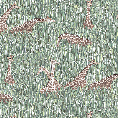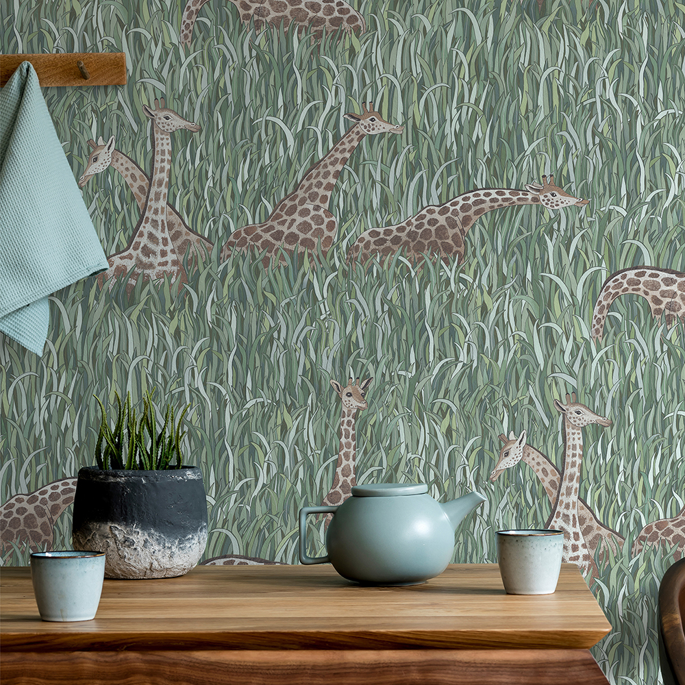 Giraffes stand tall amongst blades of long grass in this hand-painted design. Available I two colourways, one soft blues, and the other bolder greens.