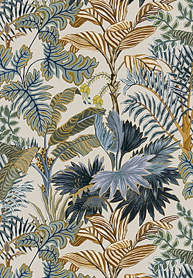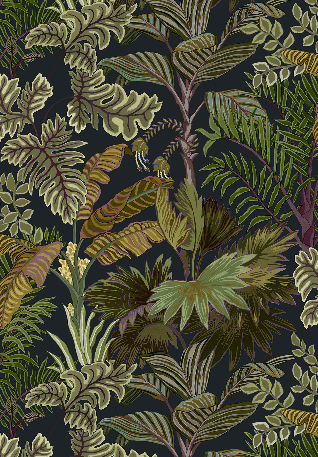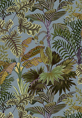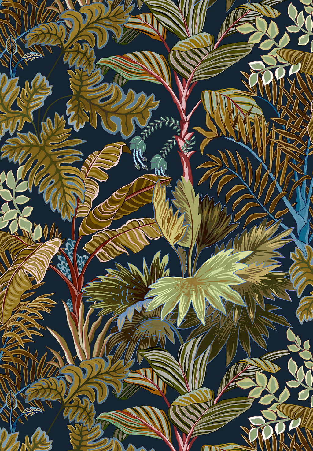 A luscious density of palm trees creating a playful and naive design. This design was hand painted with watercolour paints.
