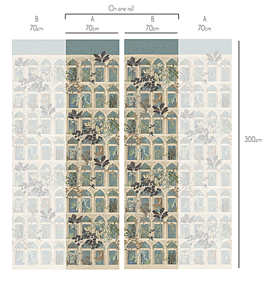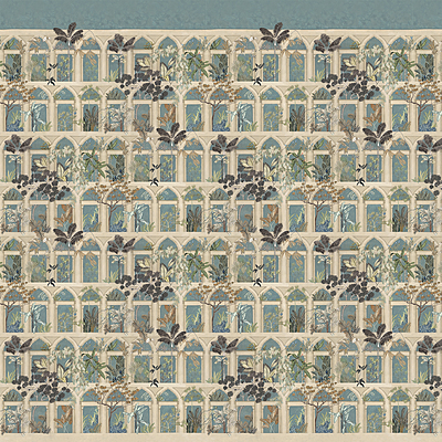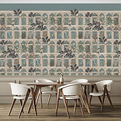 A repeating archway motif featuring abundant leaves around a make-believe structure. This artwork was painted then sanded and painted again to create movement and interest. This wallpaper panel features a fresh palette of chalky colours, perfect for adding impact to your room.