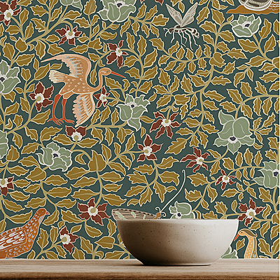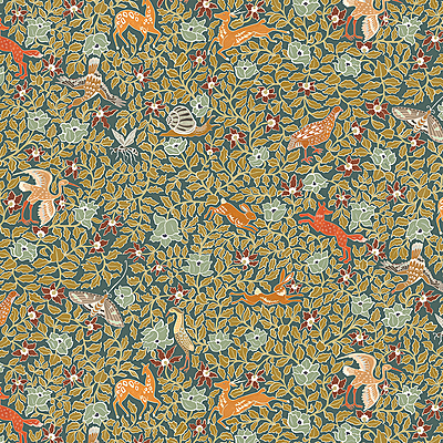 Haresfield walk celebrates British woodland charm. Hand painted hares, partridges, deer and moths are nestled amongst flowering leaves and flowers. Rich in detail and soft patterned.