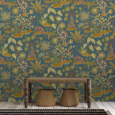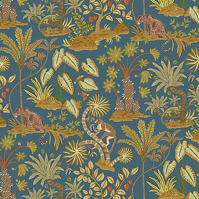 Floating islands drift beneath palms laden with fruit, where jaguars, chameleons and birds wander through lush foliage. A naïve composition with a gentle rhythm, Paradisum captures the wonder of an imagined landscape. Printed on a 70cm wide roll and available in three colourways. Printed on a 70cm wide roll and available in three carefully balanced colourways, this design captures the charm of hand-drawn artistry with a refined, timeless finish.