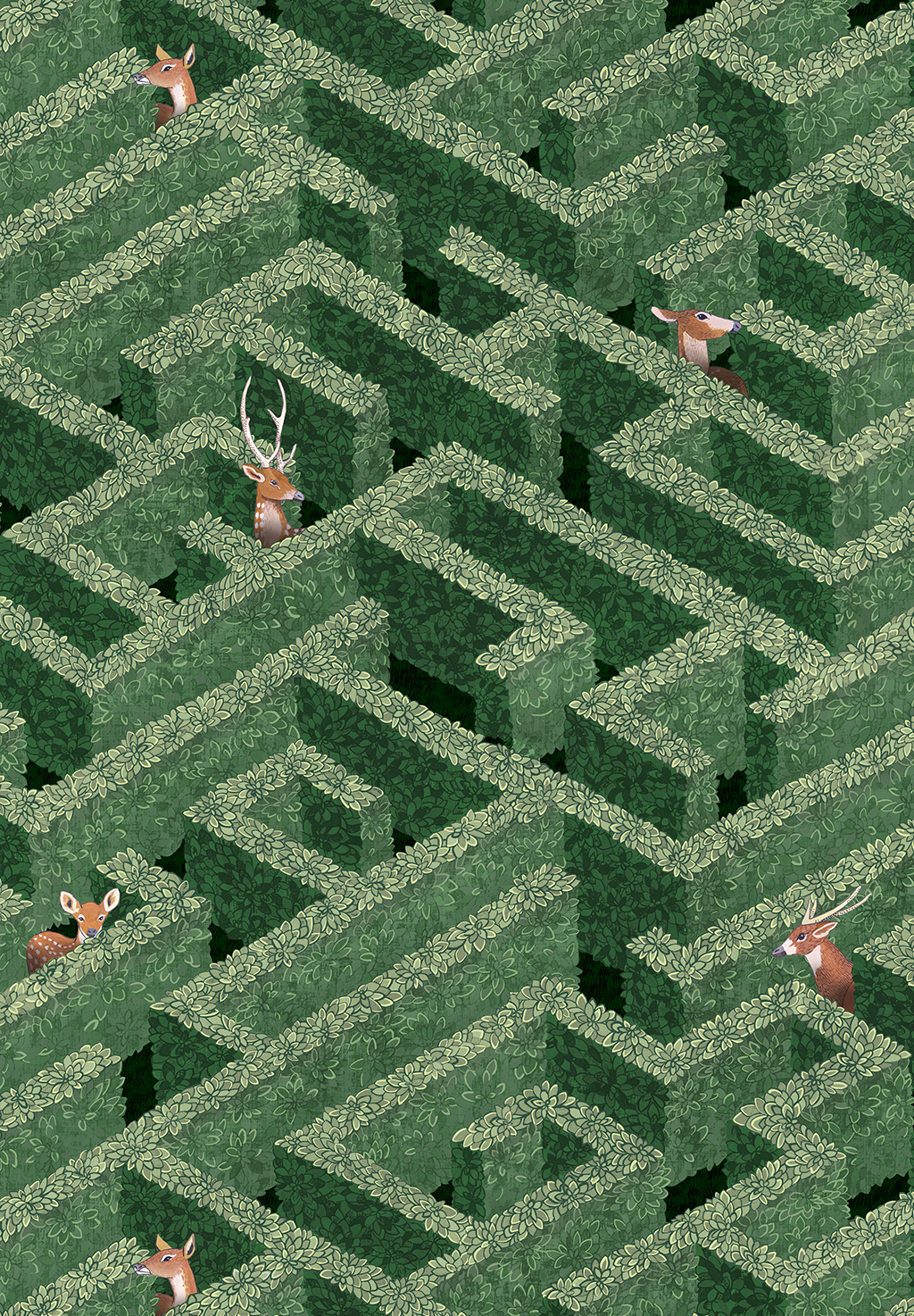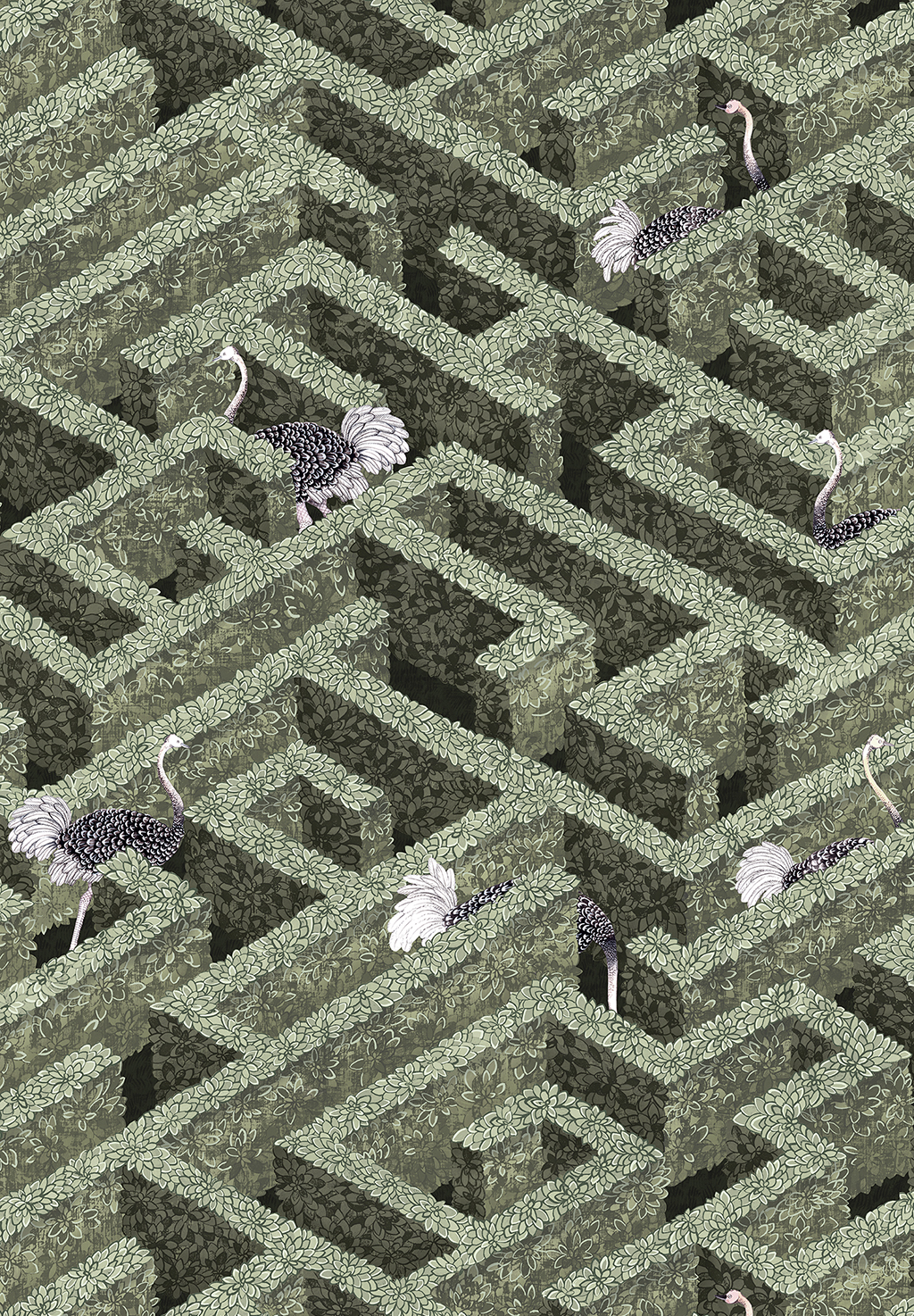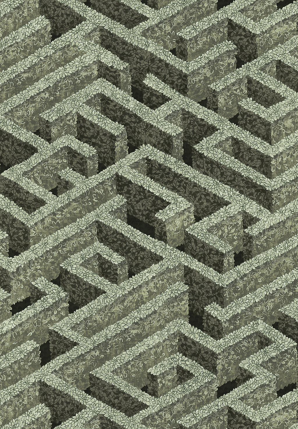 A love for Escher and mathematical design was behind this wallpaper. Technical grids and attention to angles were used to create this continuously rising repeat. Painted with watercolour paints and distressed to create a beautiful texture. Try to find your way out of this intricate labyrinth.