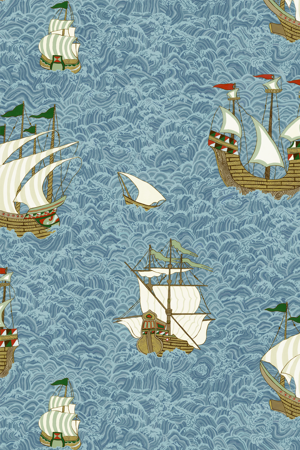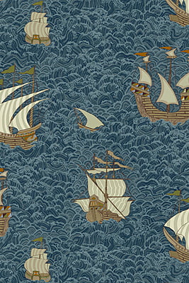 Floating ships making a fantastical journey through blue seas. This design presents an amusing take on a traditional subject. Adding a whimsical charm to any interior.