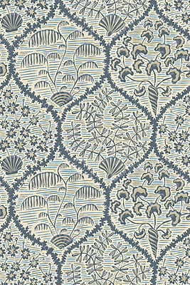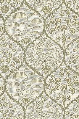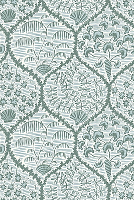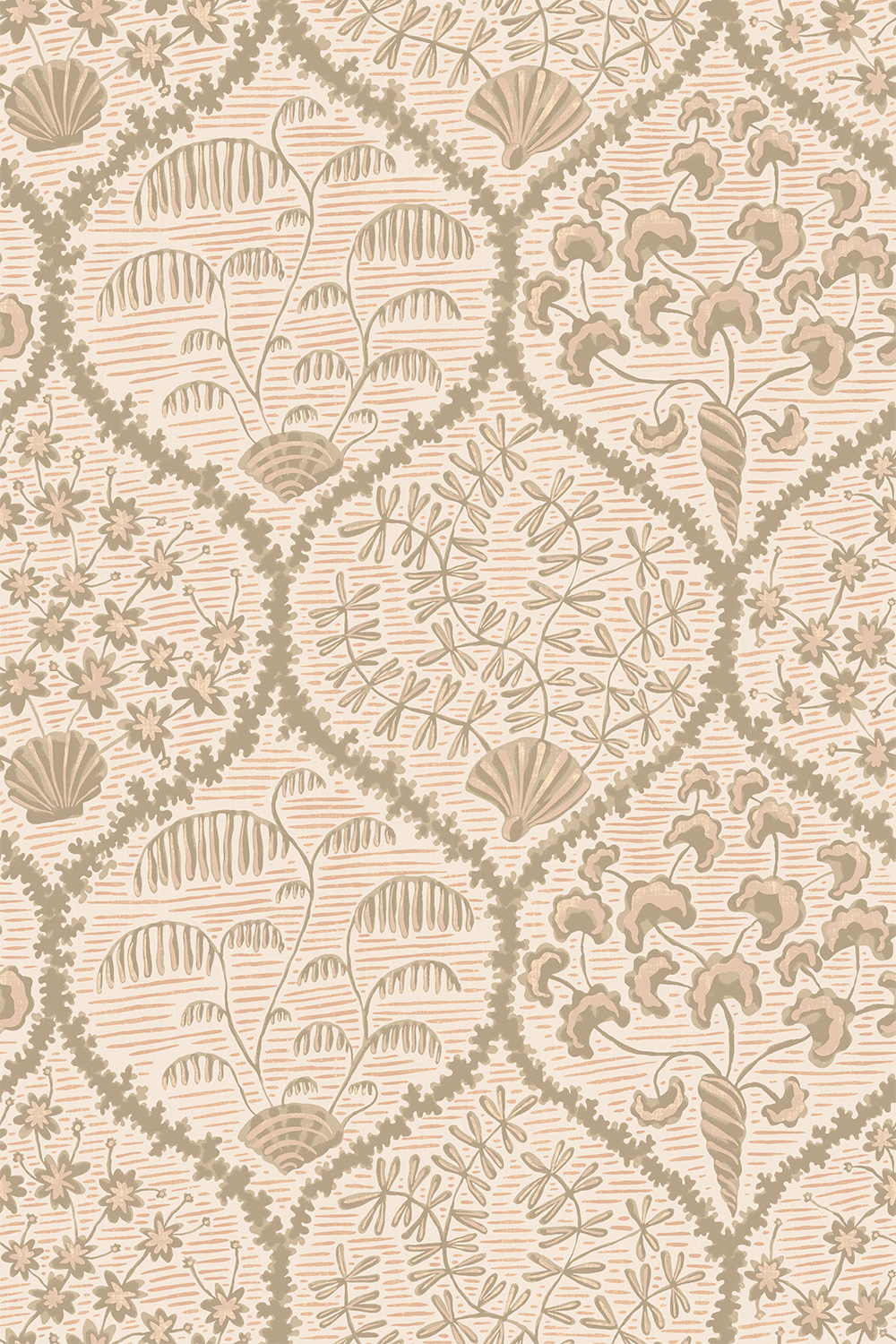 This design is inspired by antique botanical prints. An ogee shape brings the design together with different foliage appearing out of shell shapes. All hand painted by Josephine in her studio. It comes on 4 subtle colourways.
