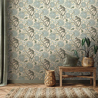 Tessellating monkeys gather among palms and ripe fruit, observed by birds beneath a gentle tropical canopy. Naïve in style yet rich in detail, Simia brings a sense of playful elegance to a room. Printed on a 70cm wide roll and available in three carefully balanced colourways, this design captures the charm of hand-drawn artistry with a refined, timeless finish.