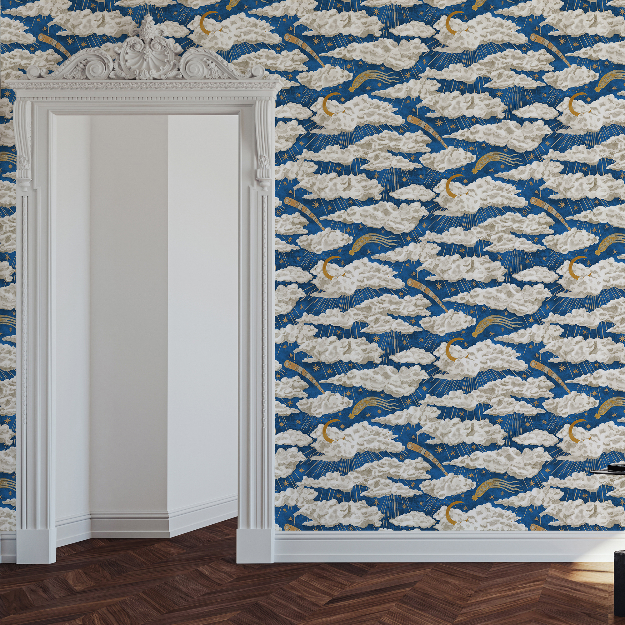The whimsical composition and naive nature of this design creates a striking wall covering. Cumulus Luna has stars and moons and Cumulus Sol has a stylised sun.