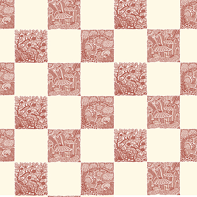 A playful whimsical design, each square contains a woodland creature. This design was hand drawn and repeated to create a check motif.