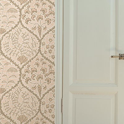 This design is inspired by antique botanical prints. An ogee shape brings the design together with different foliage appearing out of shell shapes. All hand painted by Josephine in her studio. It comes on 4 subtle colourways.