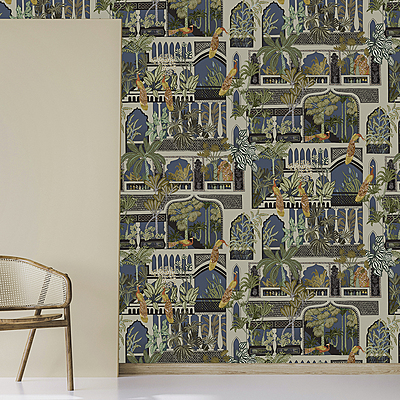 This wallpaper design was inspired by Indian architecture. It is bought to life with lush foliage and playful peacocks. This pattern has traditional geometric pattern set in architectural Doorways and Windows. All meticulously hand painted.