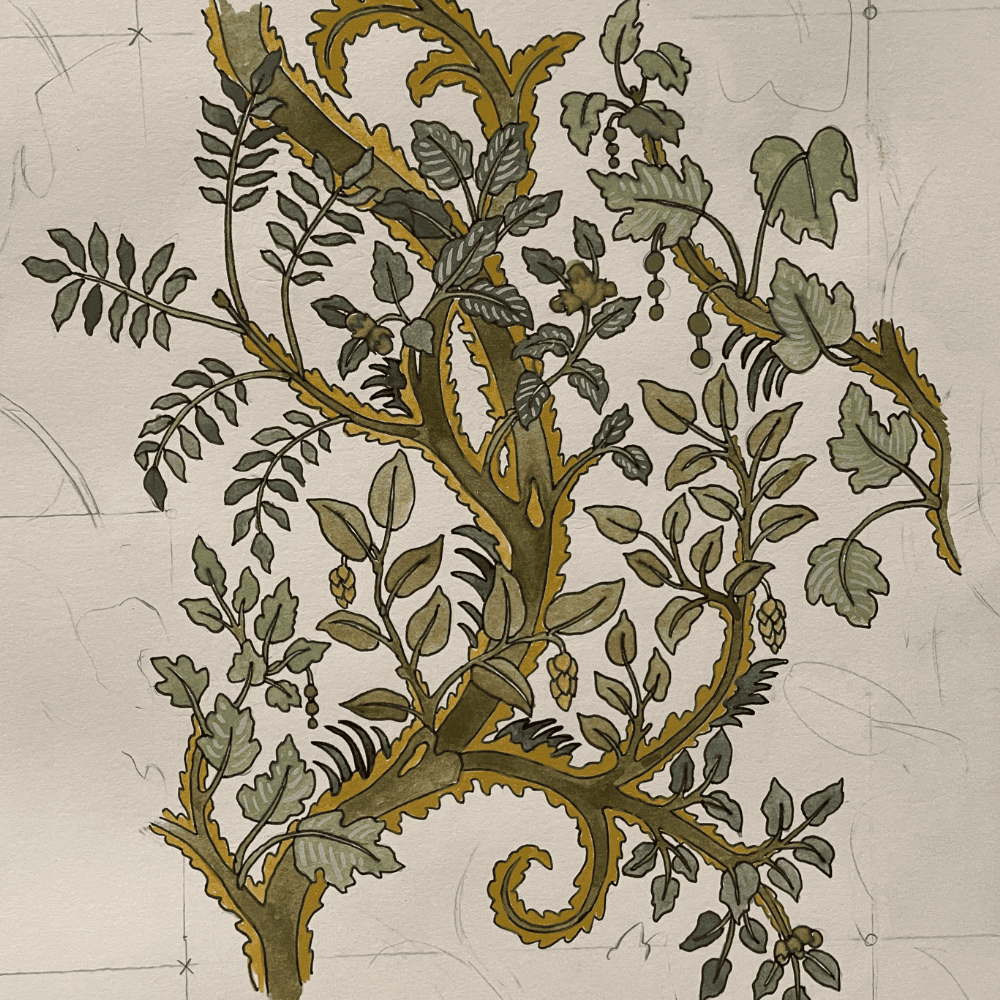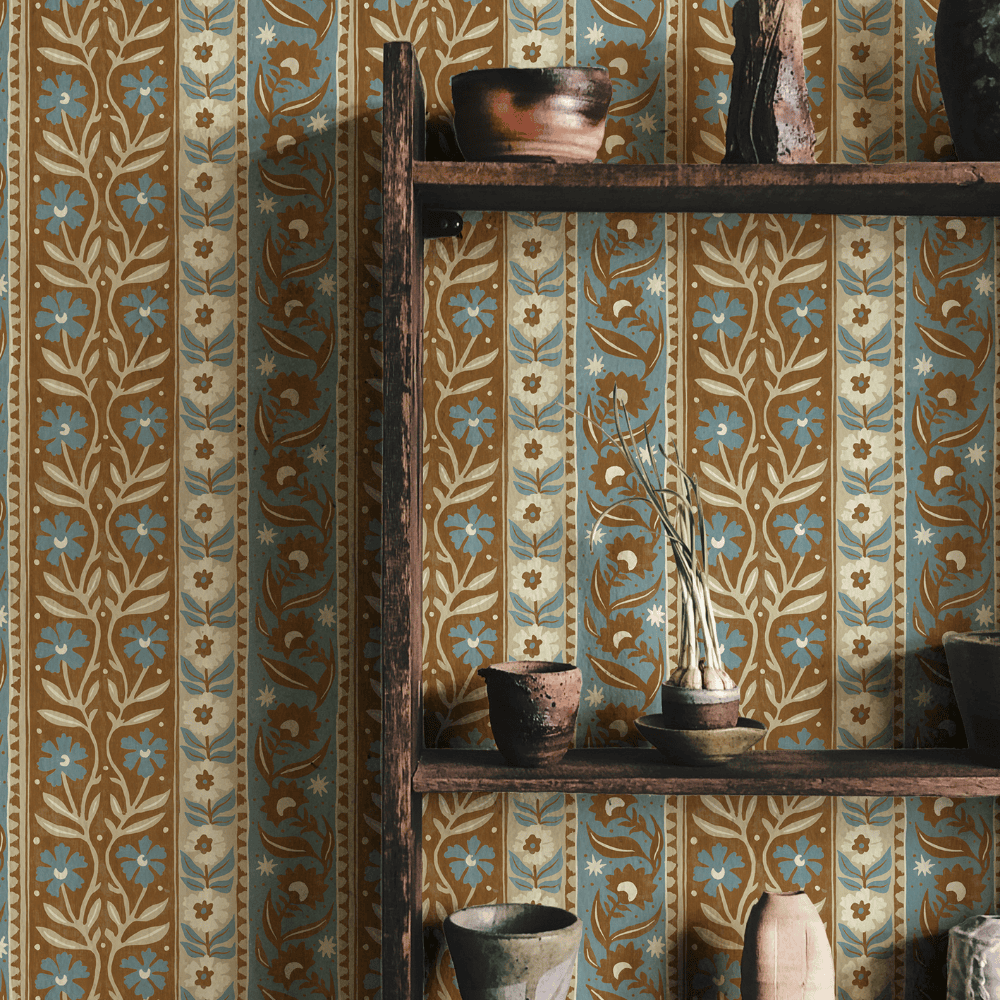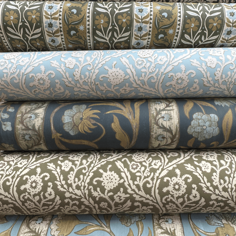 Potter Stripe draws inspiration from hand-painted ceramics and traditional painted furniture. Floral motifs are arranged in structured vertical repeats, painted directly onto wood and sanded back to create a subtle texture. The movement of the leaves came naturally, guided by brush rather than strict geometry. The design is available in five carefully curated colourways and is also offered as fabric.