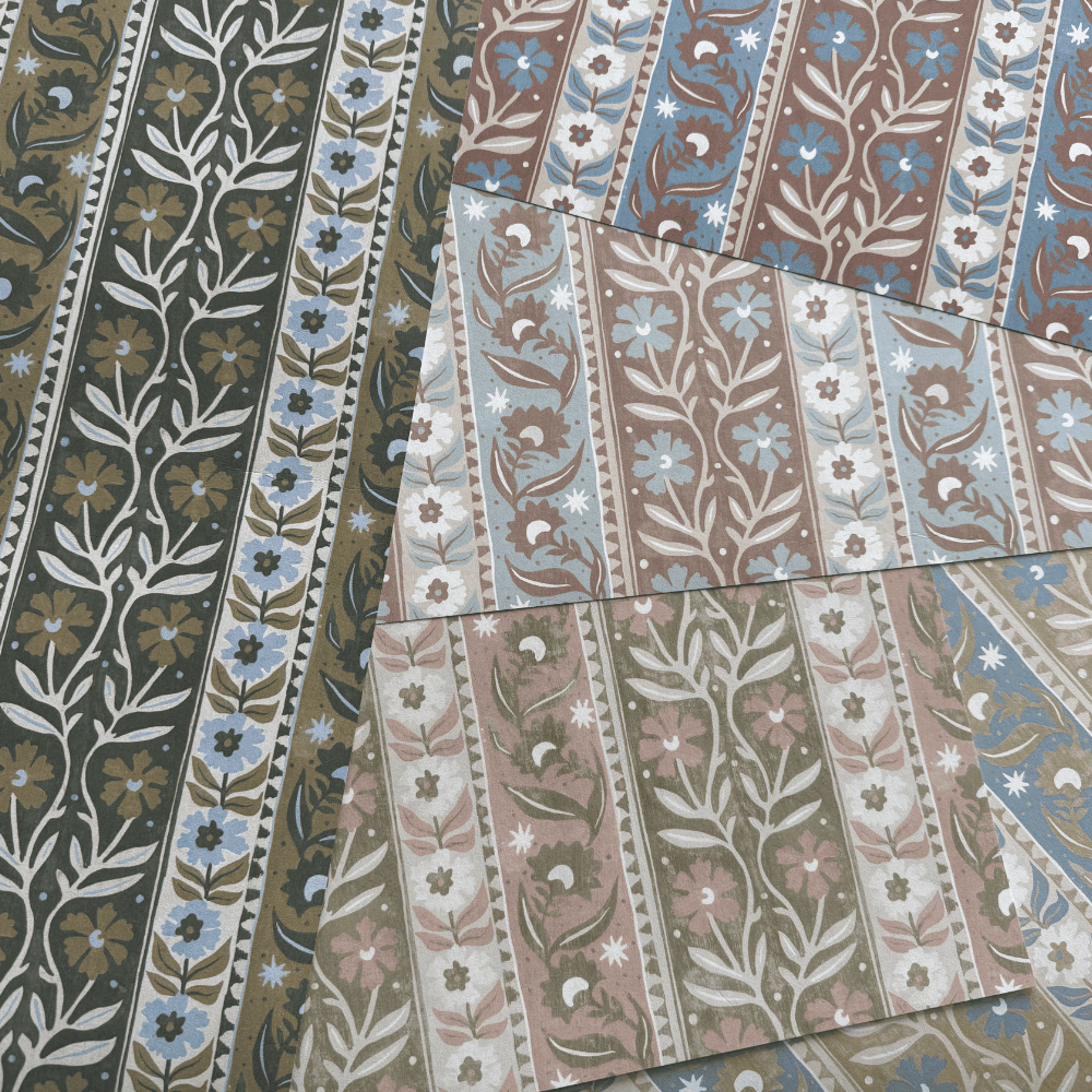 Arber Stripe takes motifs derived from Chamba Rumal and reinterprets them as a simplified floral stripe. The hand-painted design wriggles vertically down the wallpaper, combining floral elements with dots and small-scale geometric details. The layout was reworked many times before settling on a rhythm that felt both structured and relaxed. Limited to four colours, the design is intentionally versatile, offering quiet interest rather than dominance.