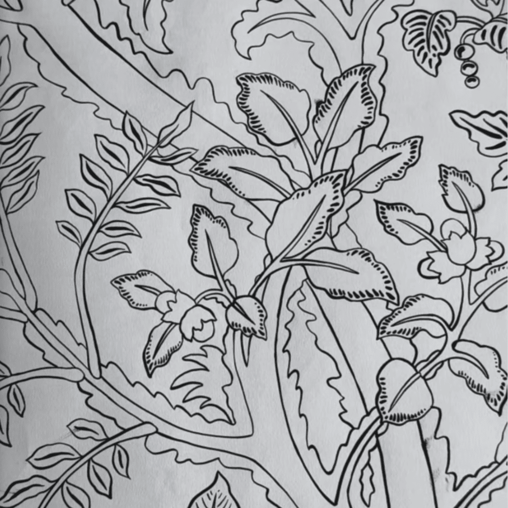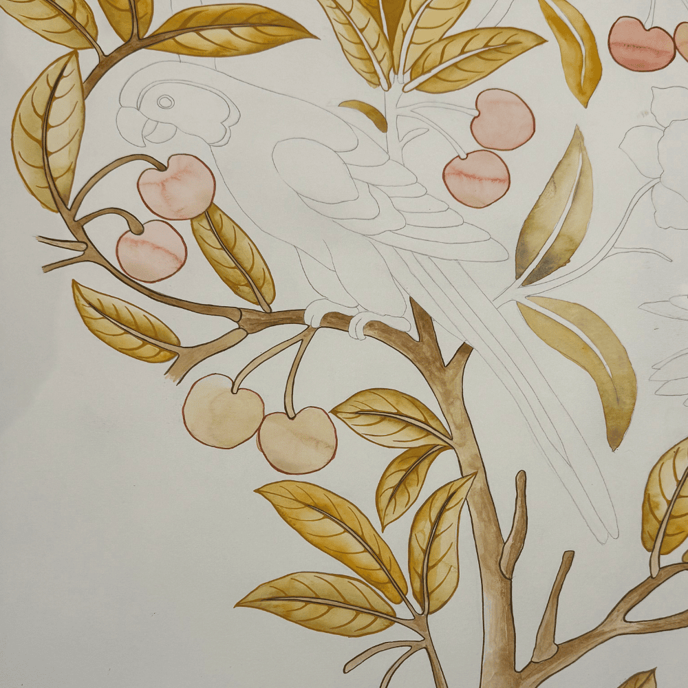 Noise Next Door was inspired by a neighbour’s garden, alive with birdsong and movement. Flowers, fruit, and birds are woven through foliage in a lively, generous repeat. Painted in gouache, each element was worked individually before being carefully outlined to enhance clarity and depth. The high repeat ensures the design reads beautifully across large expanses, maintaining balance despite its abundance.