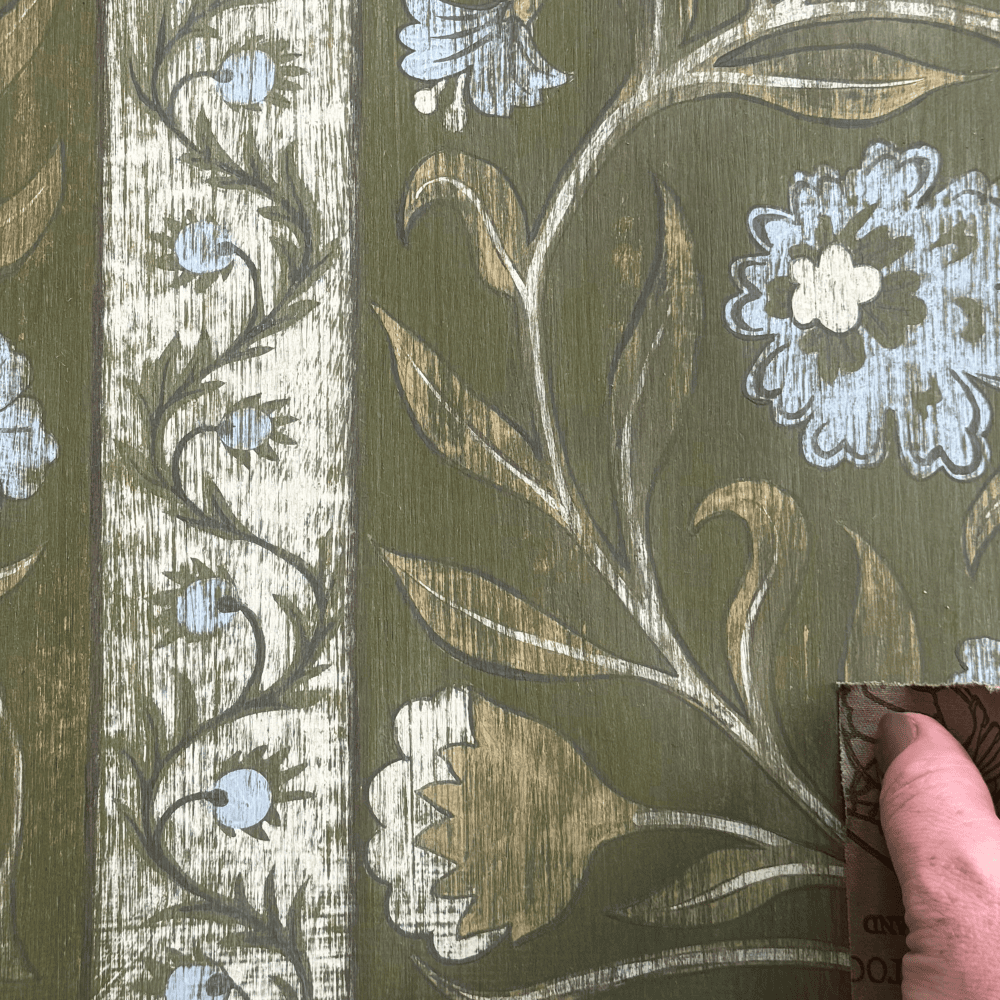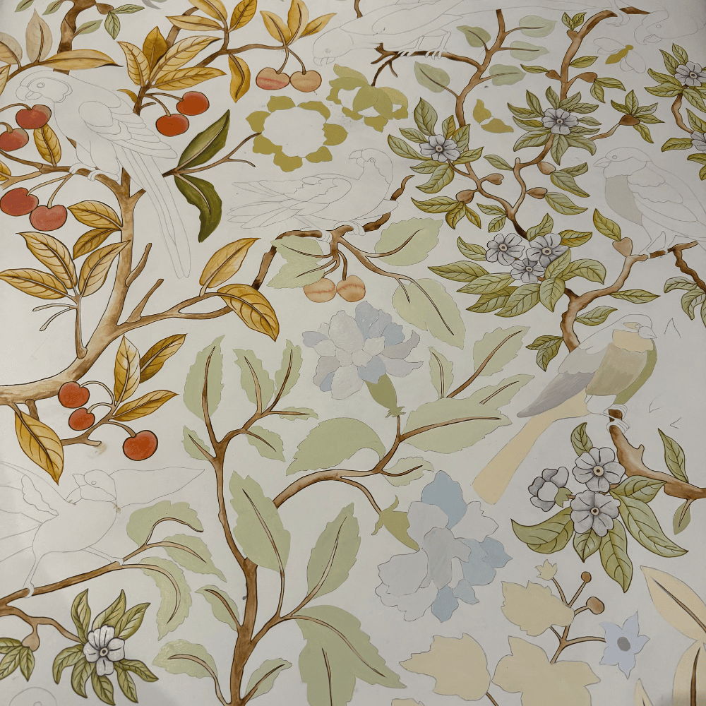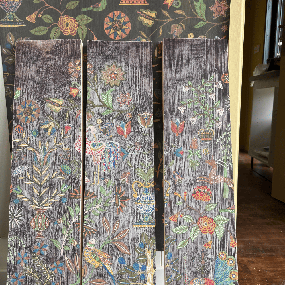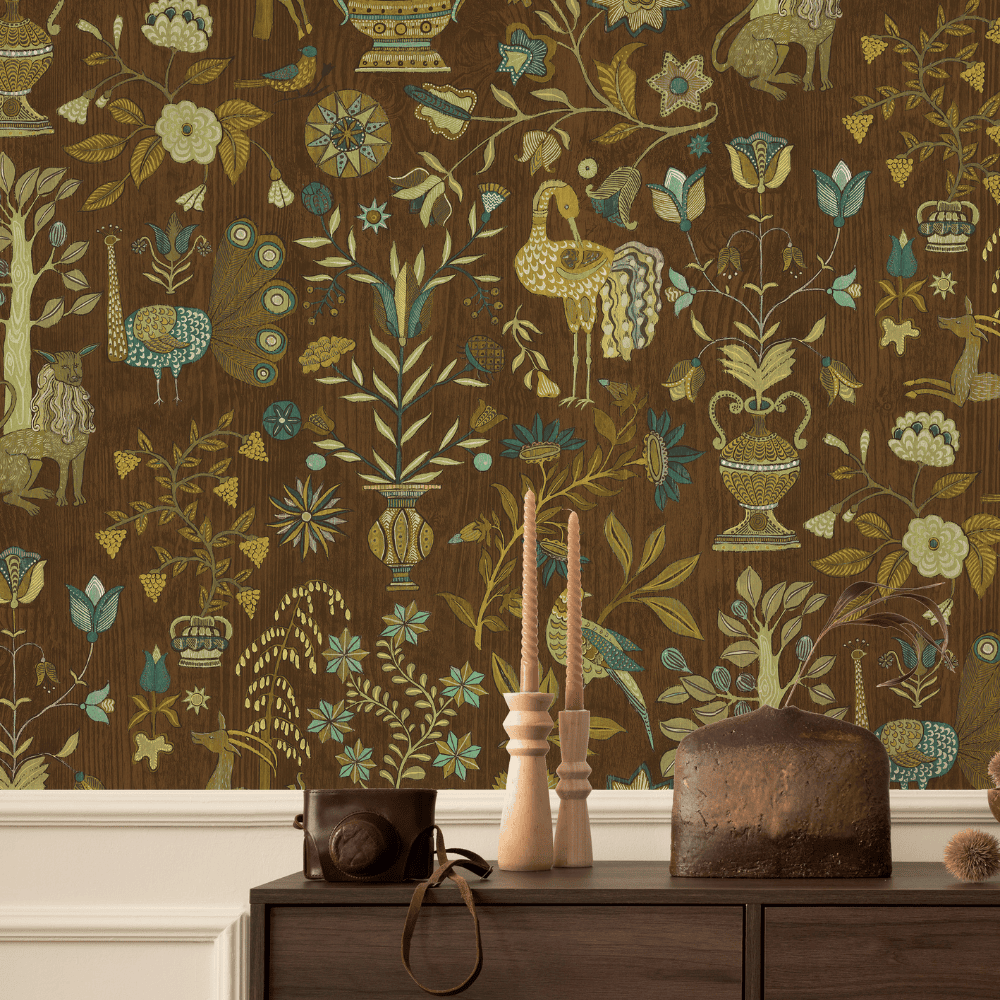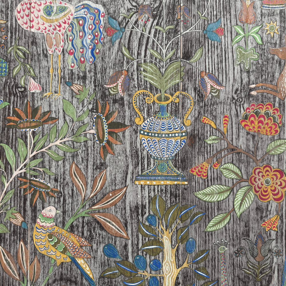 Fable Garden is one of the most representative designs in the collection. Folk-inspired and richly narrative, it features stylised flora, birds, lions, and vases of flowers, all set against a painted wood-grain background. To fully understand how the design should feel, I painted it directly onto wooden panels, joined them together, and sanded the surface back to create a worn, time-softened effect. This process allowed the brush marks and grain to interact naturally, giving the wallpaper a sense of depth and age that would have been impossible to achieve digitally.