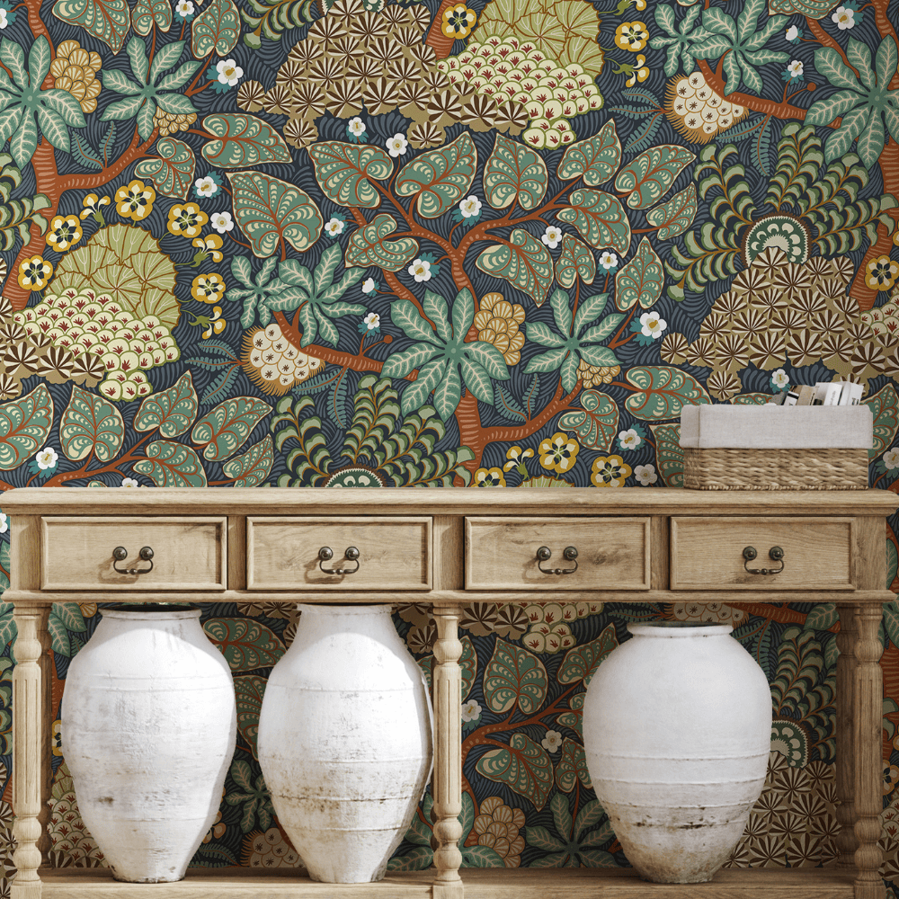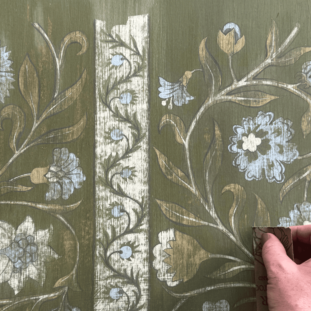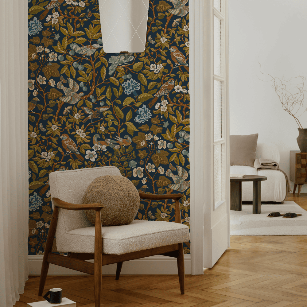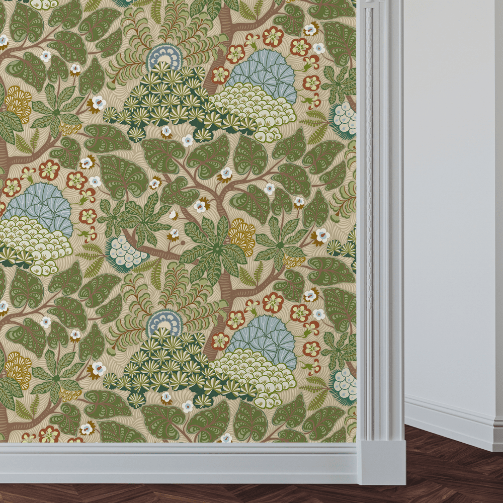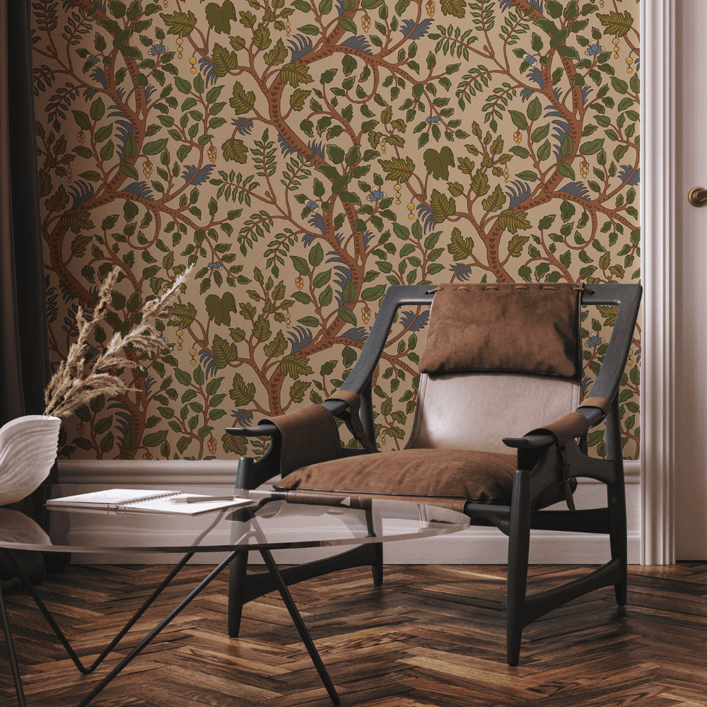 Fable Garden is one of the most representative designs in the collection. Folk-inspired and richly narrative, it features stylised flora, birds, lions, and vases of flowers, all set against a painted wood-grain background. To fully understand how the design should feel, I painted it directly onto wooden panels, joined them together, and sanded the surface back to create a worn, time-softened effect. This process allowed the brush marks and grain to interact naturally, giving the wallpaper a sense of depth and age that would have been impossible to achieve digitally.