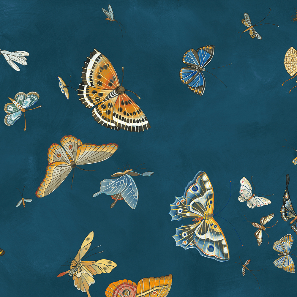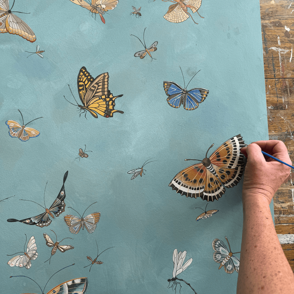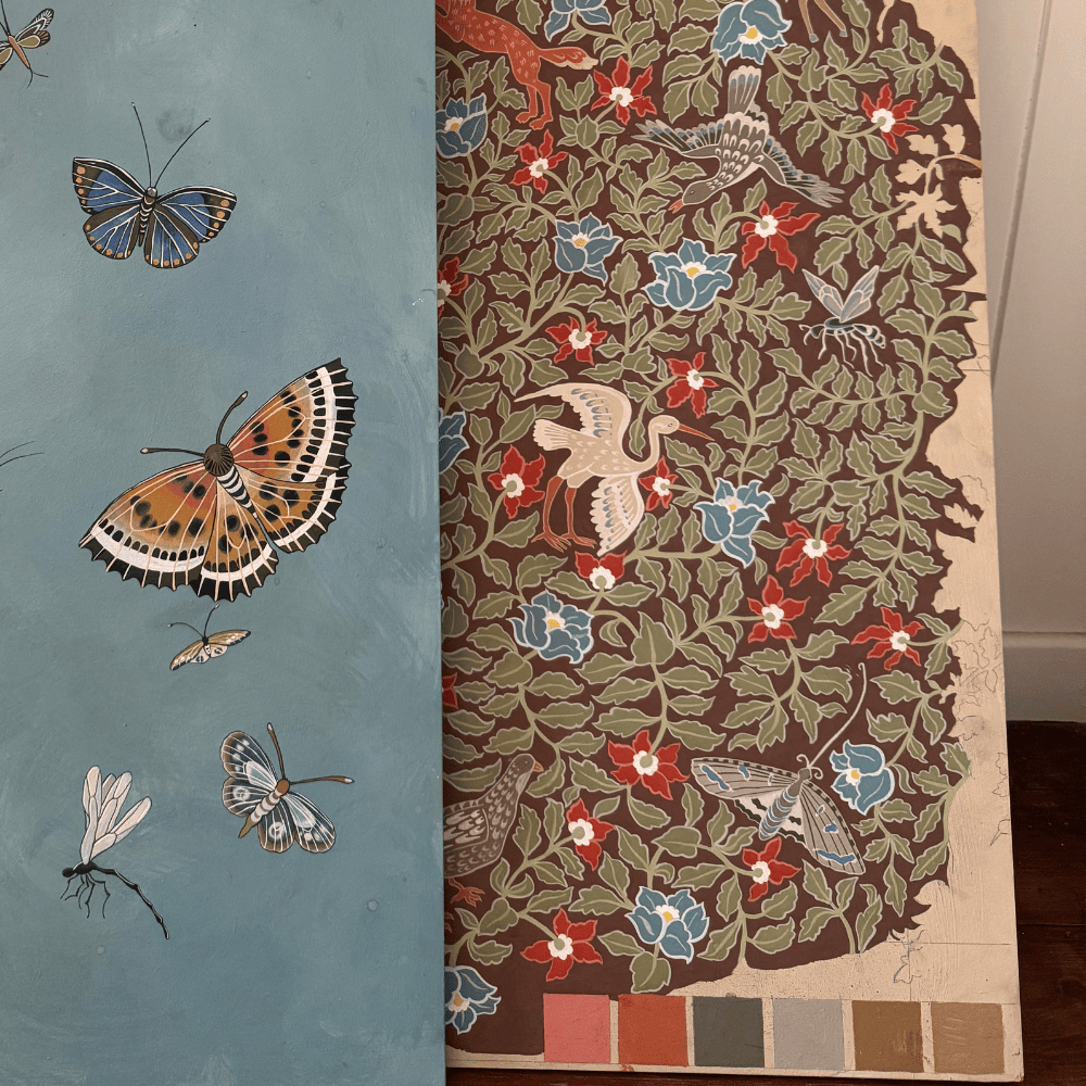 Butterflies is a playful, hand-painted design featuring butterflies and insects painted onto wooden panels to create a fresco-like surface. Inspired by Italian fresco painting, the background includes subtle cloud textures rather than flat colour. Working from photographs, I deliberately altered proportions and markings to avoid overly naturalistic repetition, allowing the design to feel imaginative rather than illustrative.