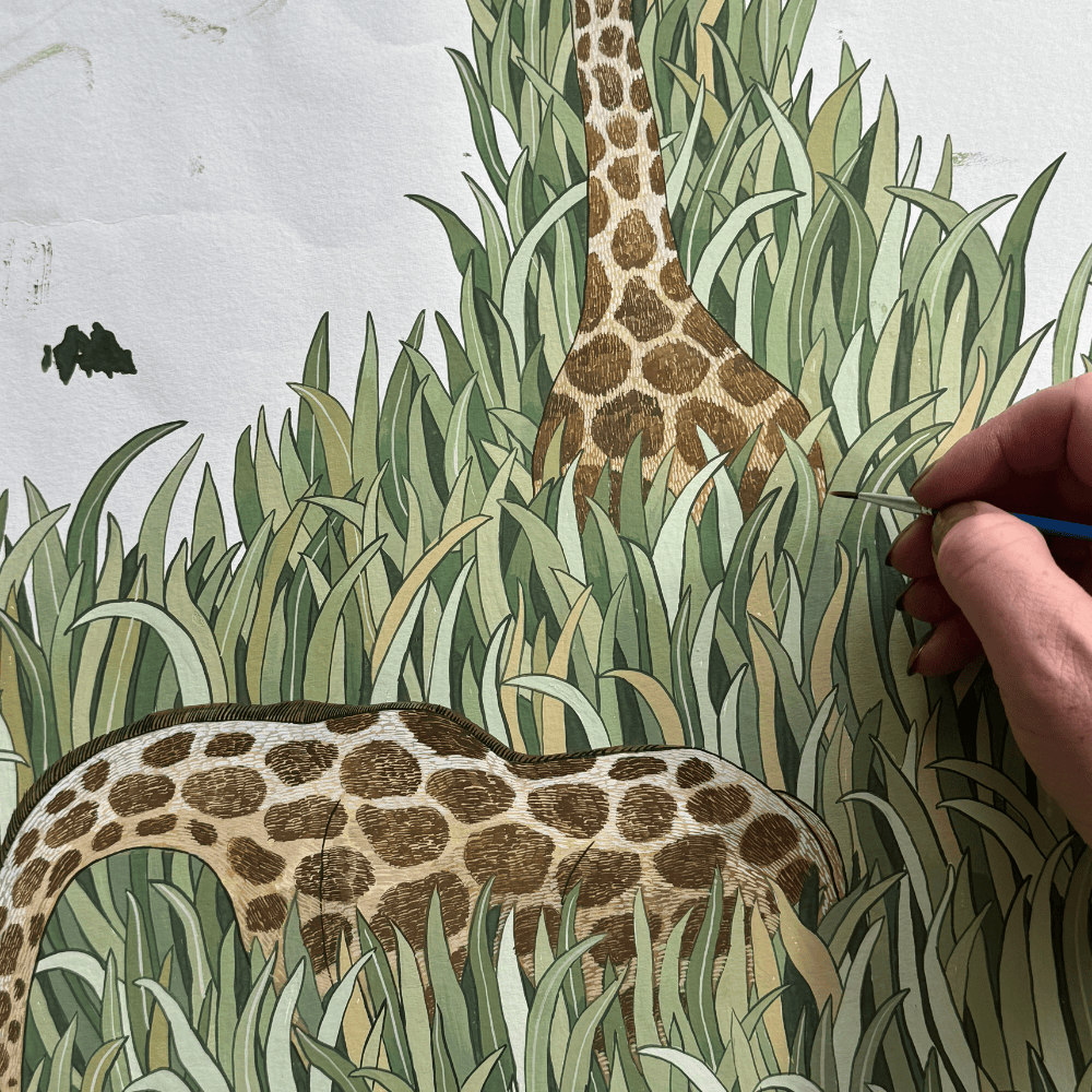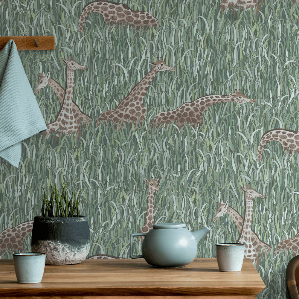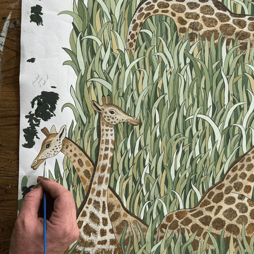 Giraffes features tall, hand-painted giraffes standing among long blades of grass. The layout was first resolved in pencil before every blade of grass and every giraffe marking was painted by hand. Offered in two colourways, one soft and one bolder, the design balances scale with calm repetition.