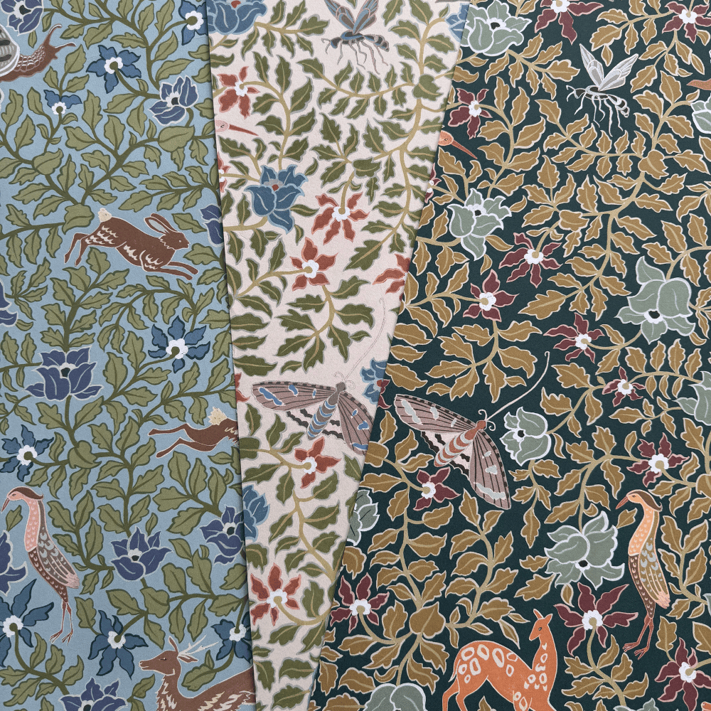 Brushwood is a sister design to Hedgerow from a previous collection. While the composition remains similar, the rendering is intentionally more graphic and pared back. Different species of British trees were hand drawn, but texture was deliberately reduced to create a cleaner, more architectural option. This design reflects my interest in offering alternatives within a collection: the same idea expressed through different finishes.