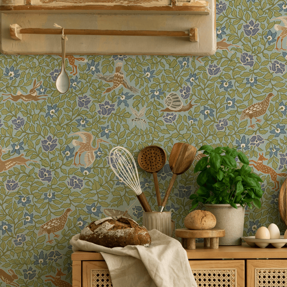 Haresfield Walk celebrates British woodland life. Hand-painted hares, partridges, deer, moths, snails, ducks, herons, and insects are nestled among flowering leaves. Inspired by walks through the countryside, the design is rich in detail yet softly patterned. Painted in gouache and outlined with fine lines of paint, it retains a lightness that allows the imagery to sit gently on the wall.