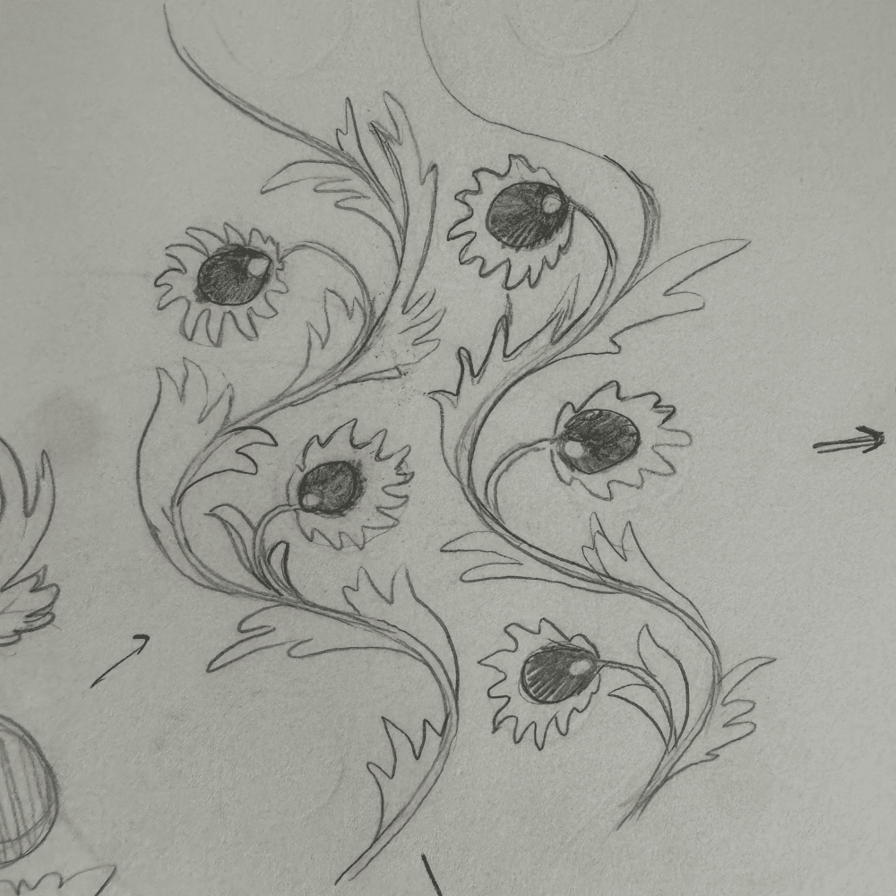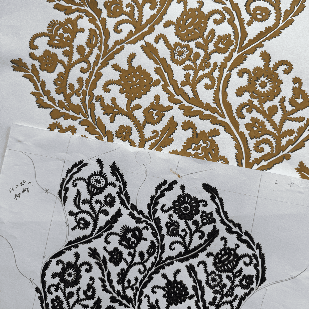 Letti is a delicate floral design interwoven with lace-like details, inspired by historic lace and devotional paper works. Painted motifs are given a subtle shadow to create a gentle three-dimensional effect. Careful colour selection was essential here, ensuring the design remains light and versatile while retaining structure and depth.