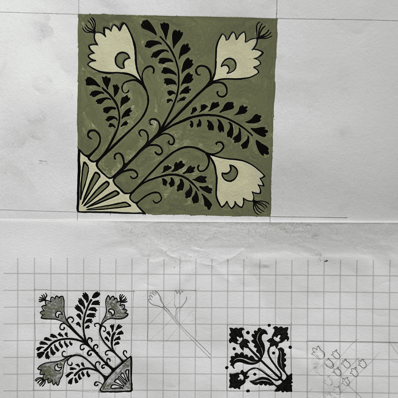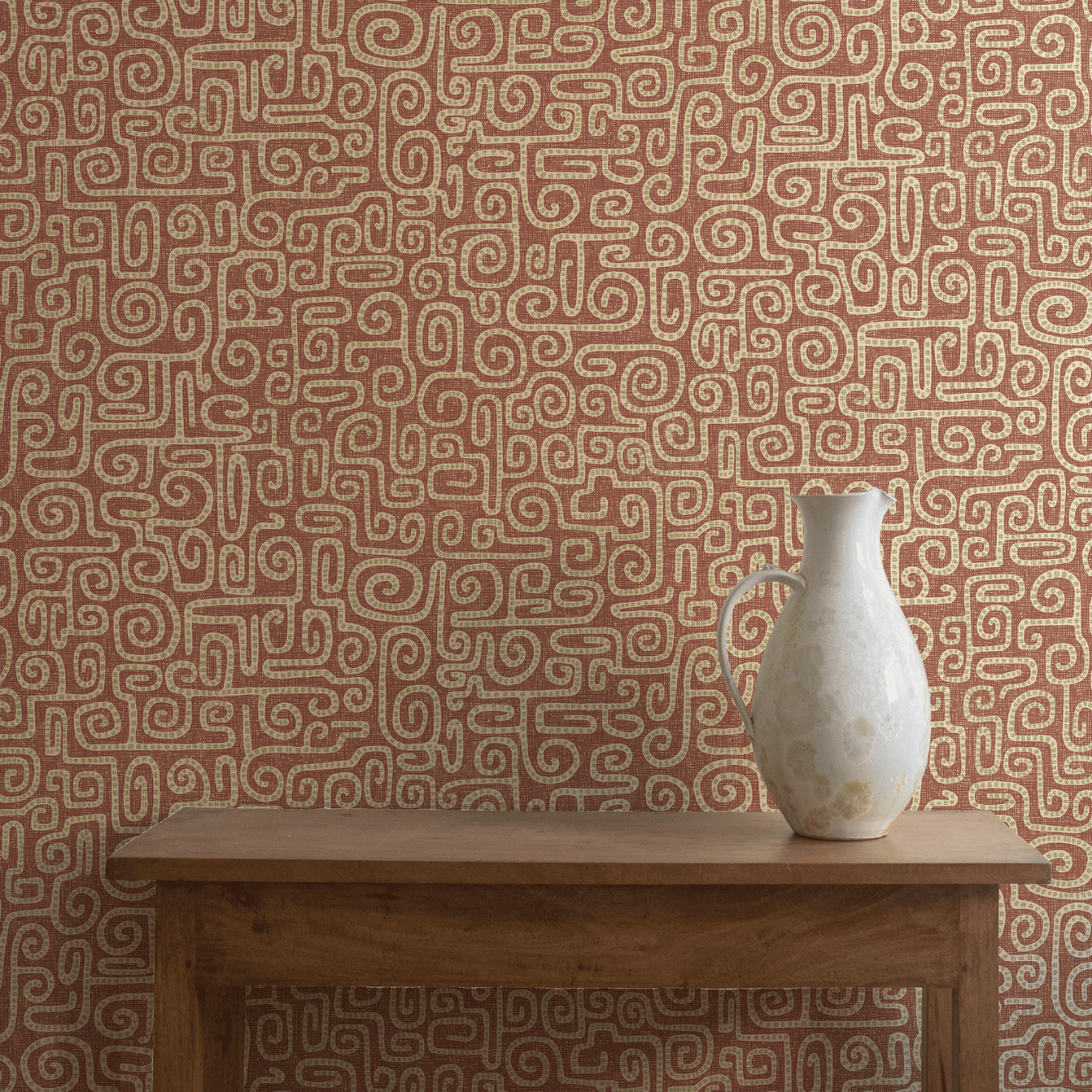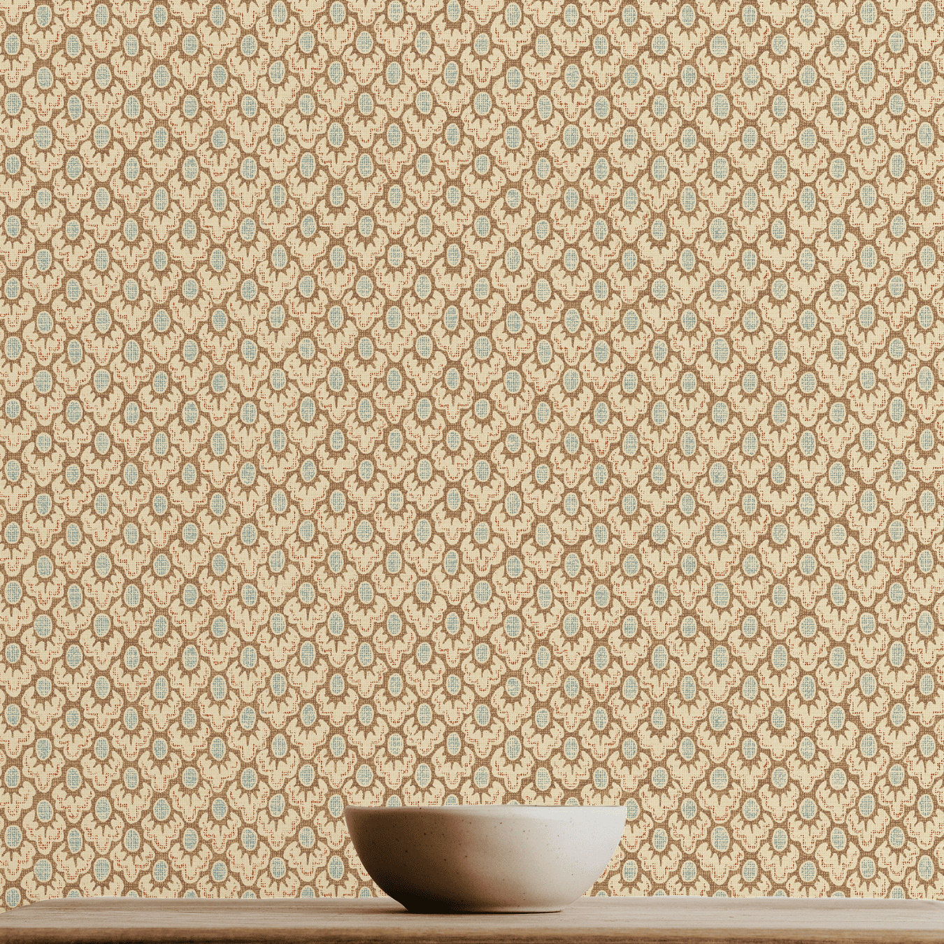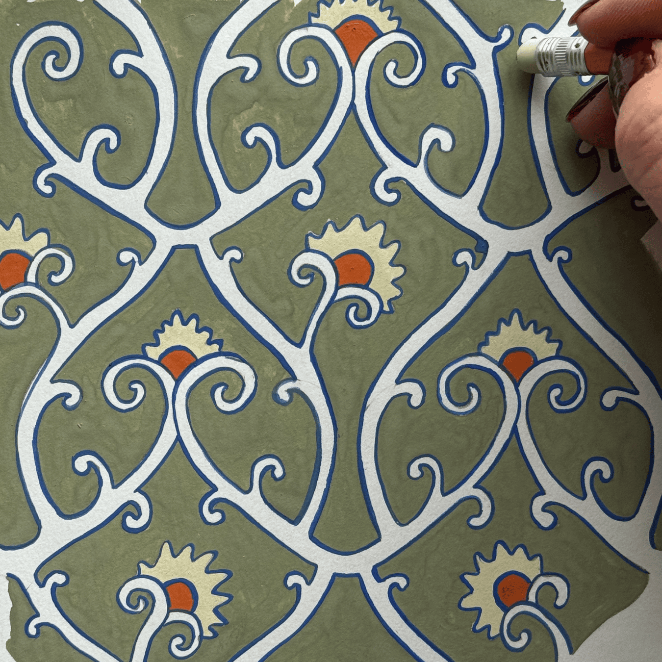 Each motif is individually painted and encircled by a fluid line, allowing slight irregularities to remain visible. A deliberate choice that softens the geometry and prevents the design from feeling overly formal. This interplay between structure and gesture creates a pattern that is both composed and approachable. Mallow Trellis brings a refined rhythm to interiors, combining decorative restraint with the warmth of hand-rendered mark making.