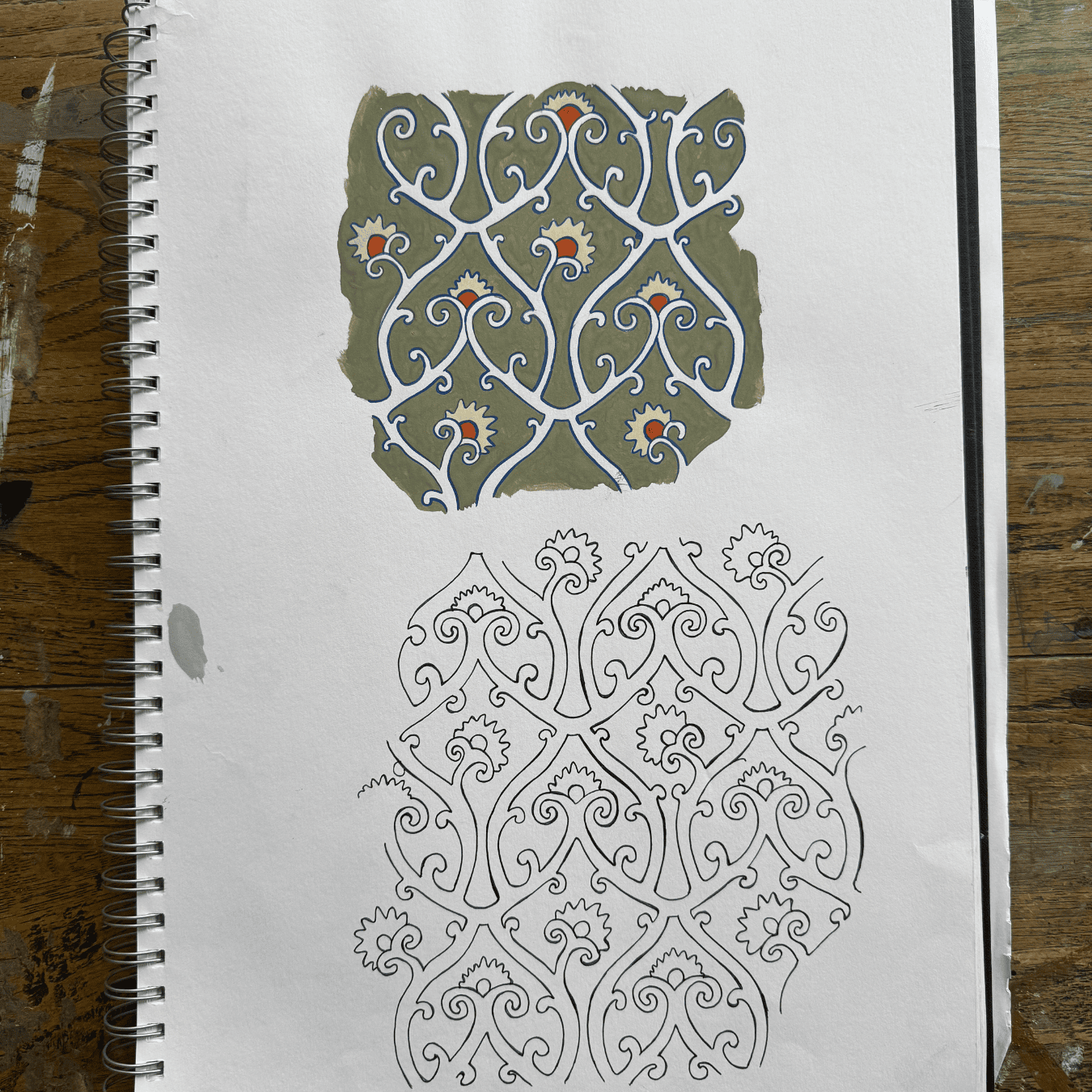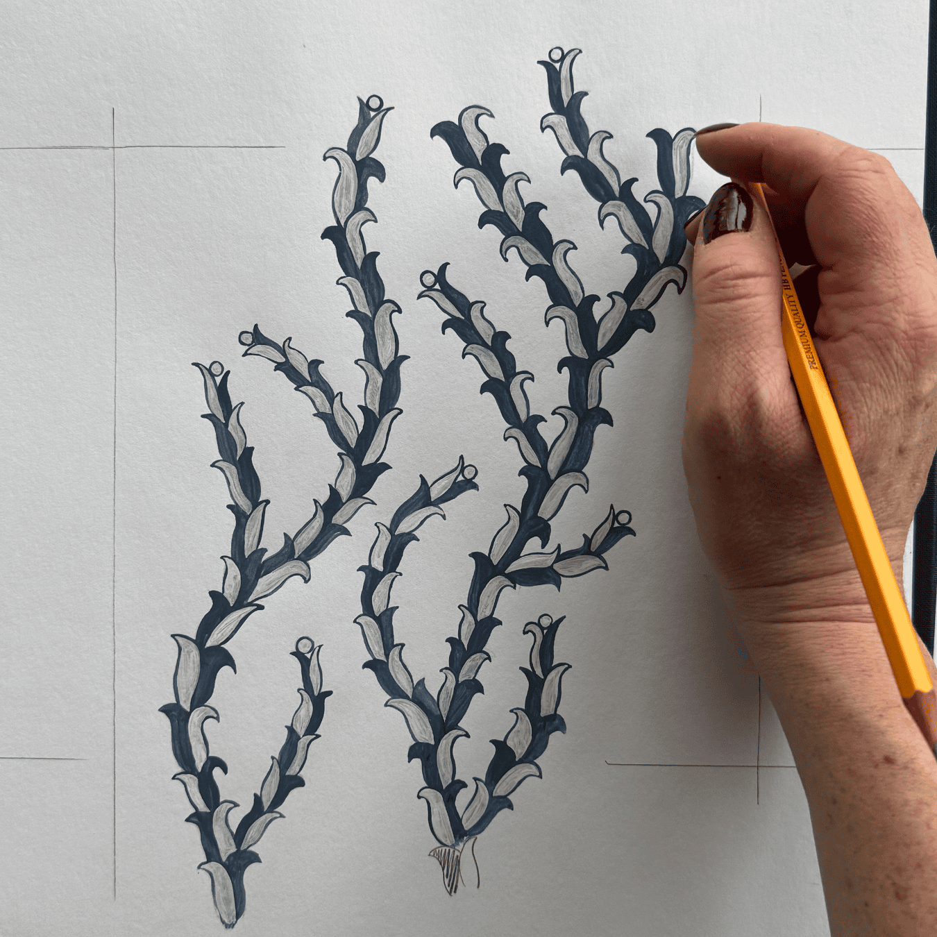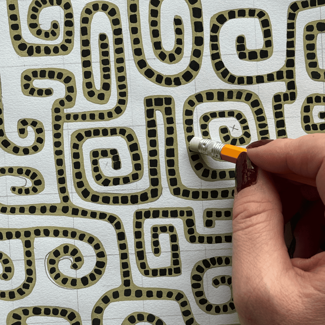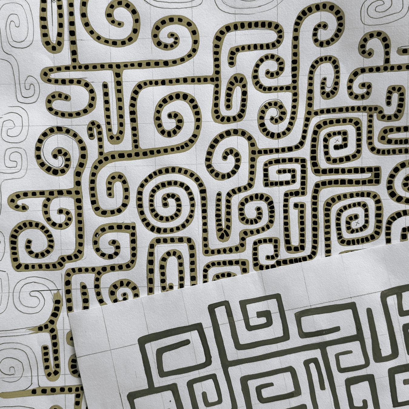 Wiggleton draws its inspiration from Pre-Columbian artwork, where confident geometric markings and rhythmic linework create surfaces that feel both expressive and enduring. The design began as a freely painted, undulating line centred with a single dot, forming a gentle tessellation that balances spontaneity with order. Further influence came from historic ceramic vessels studied through the Denver Art Museum online collections, whose assured brushwork demonstrates the lasting power of simple, deliberate marks. Interpreted through a contemporary hand-drawn process, Wiggleton celebrates pattern as gesture.