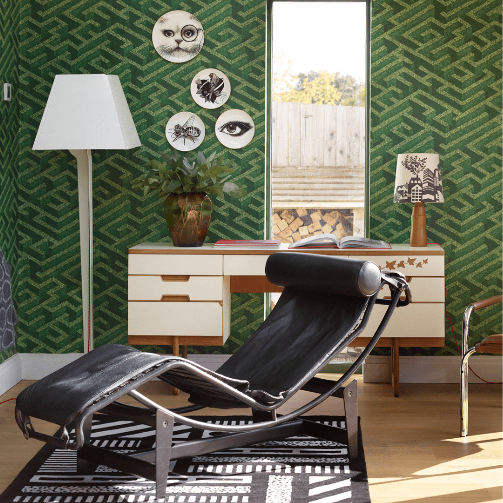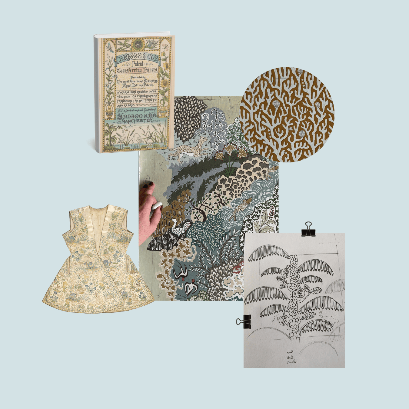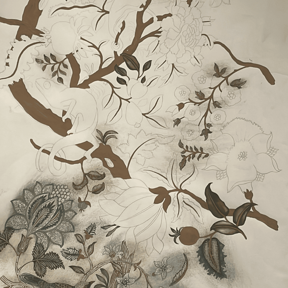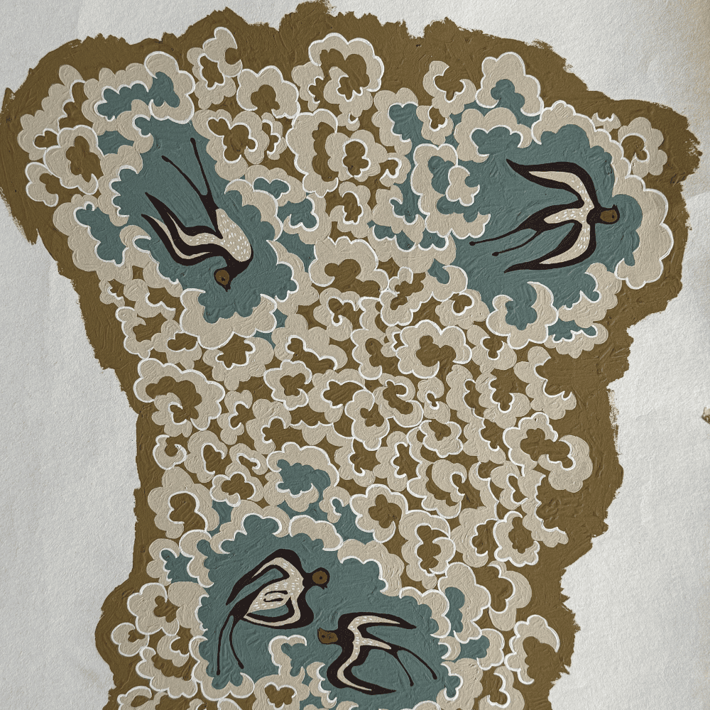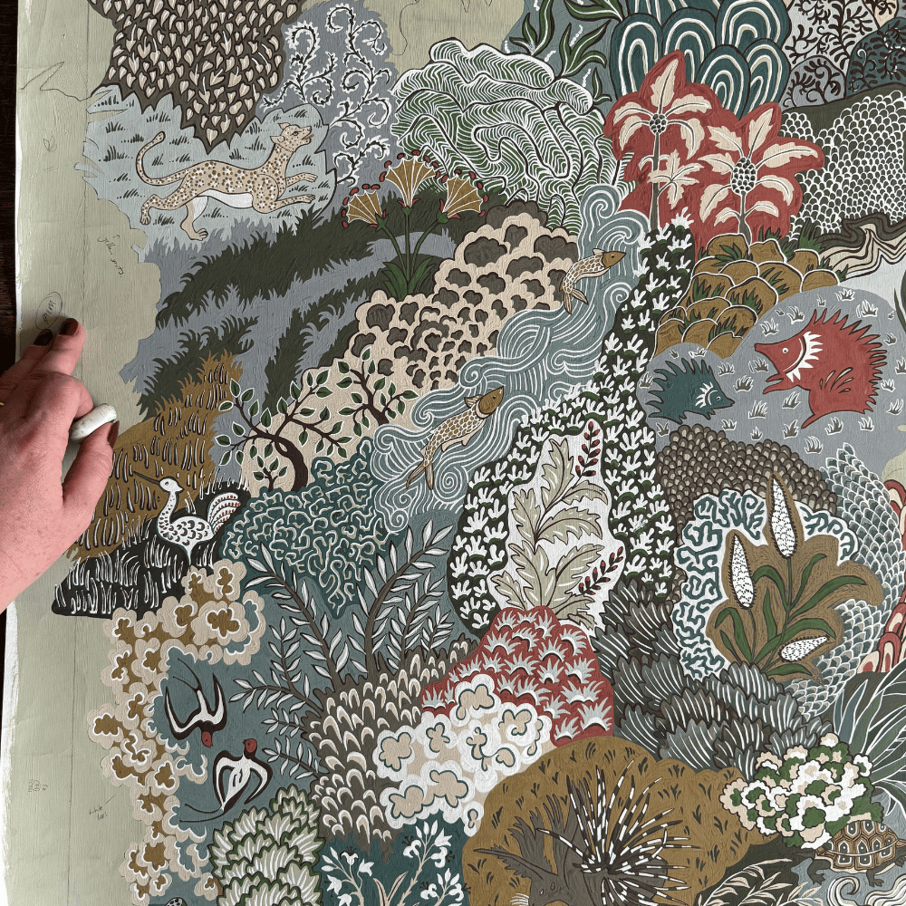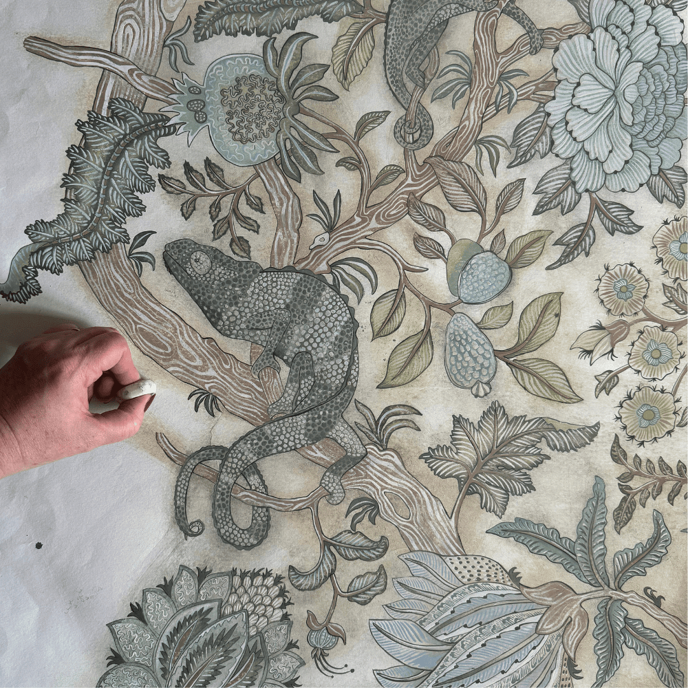 Chameleon Trail is a large, hand-painted repeat featuring chameleons woven through traditional floral forms. This design took the longest to paint, due to the scale of the repeat and the level of detail required. Motifs were informed by historic textiles, while the chameleons reference botanical illustration. Texture was built through multiple layers of paint, sanding back, and repainting, allowing colours to blend and settle into the surface. Numerous layouts and sketches were made before the final painted version was resolved.