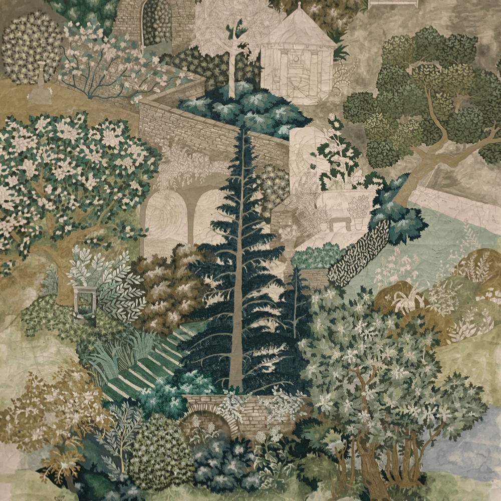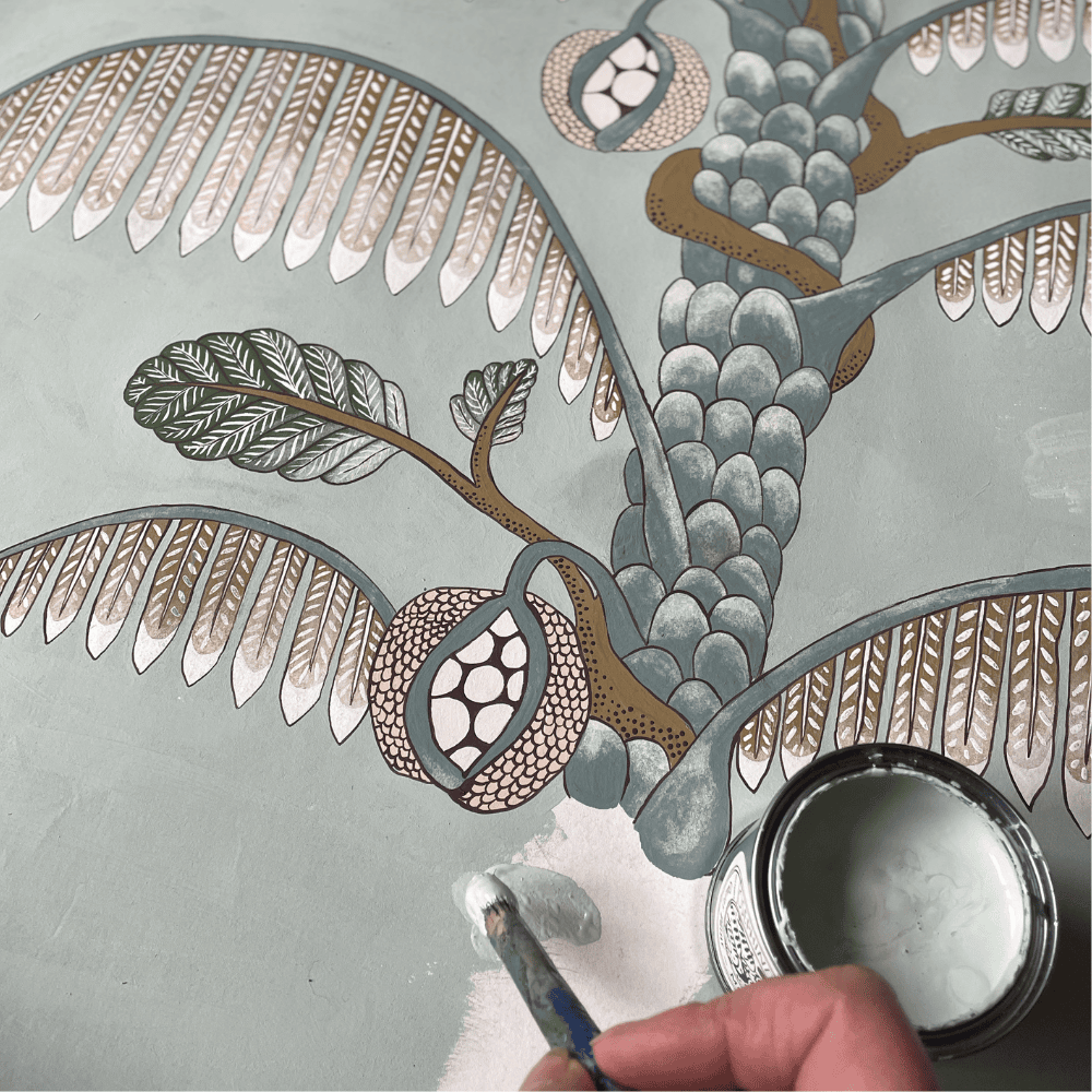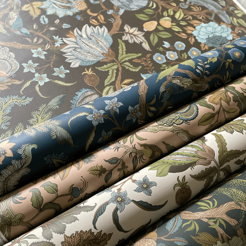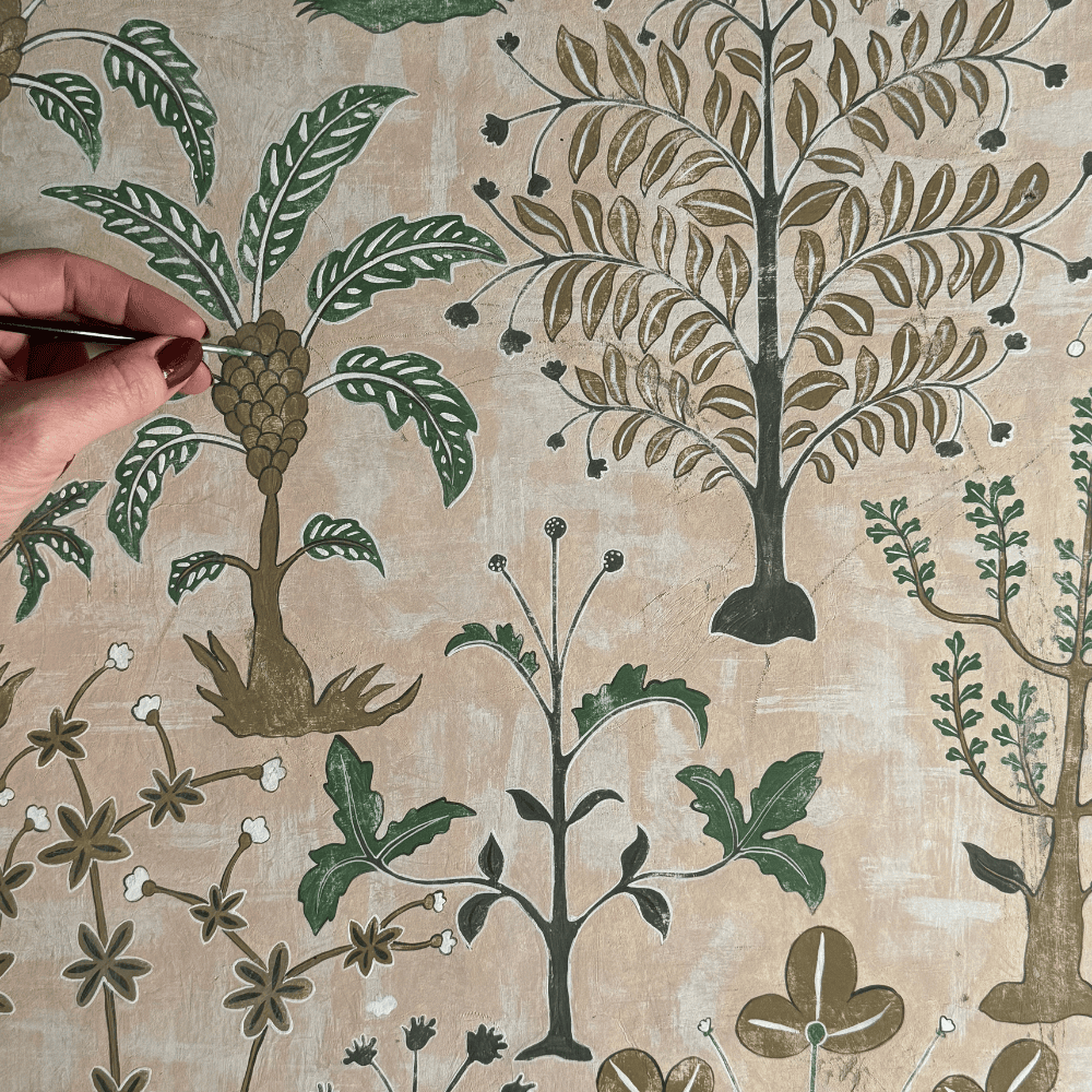 Miserden Trees was developed by carefully extracting hand-painted elements from the Miserden Mural and reworking them into a repeating wallpaper. Mulberry, oak, evergreen trees, and butterflies were repainted and adjusted to suit a repeat format. The design retains the depth and texture of the original mural and can be used either as a coordinating wallpaper or as a standalone design.