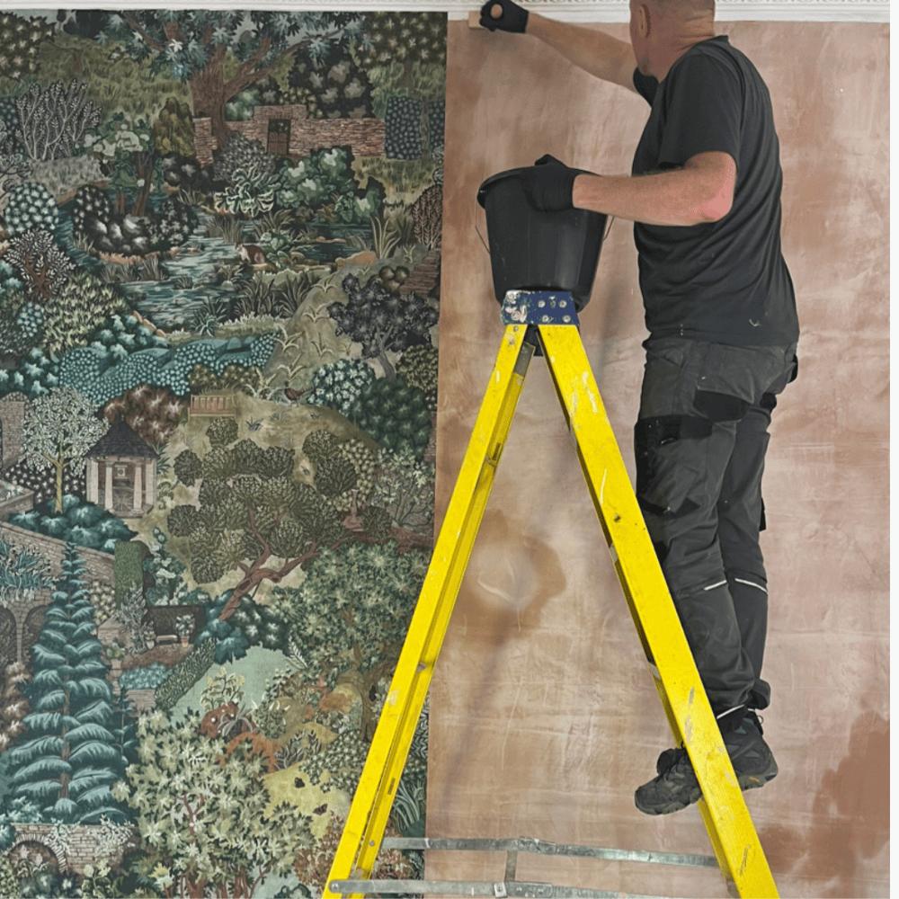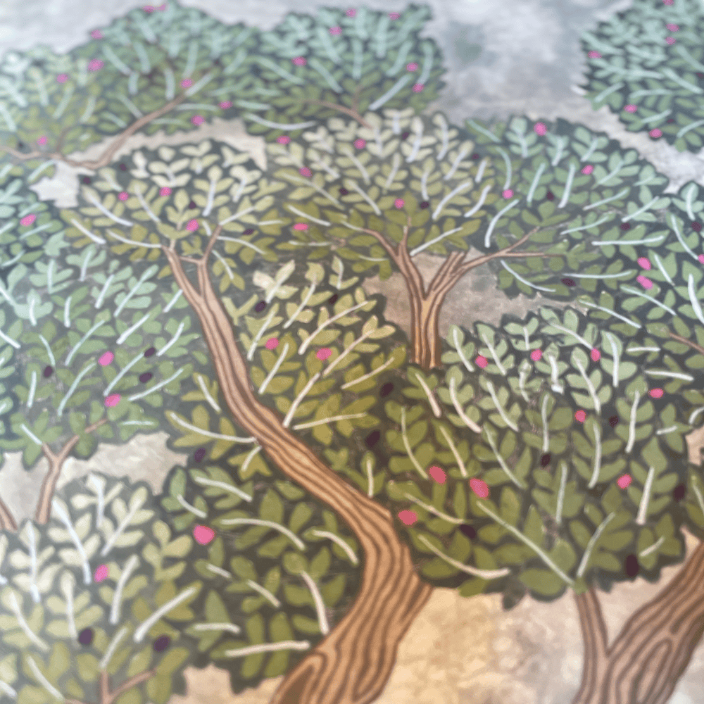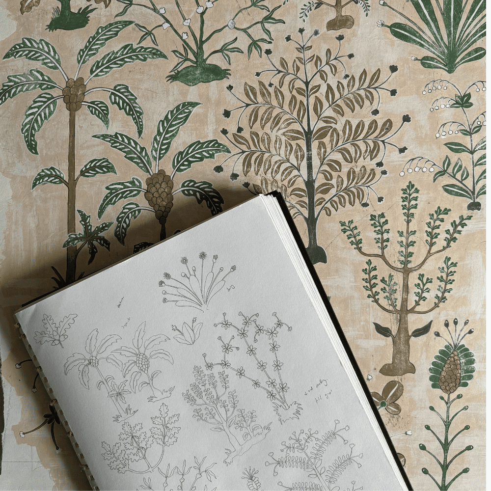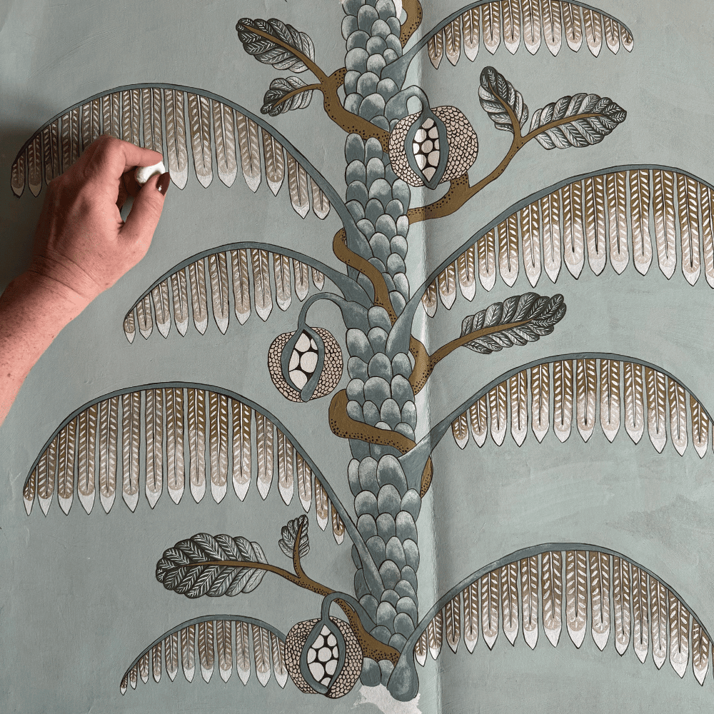 Miserden Trees was developed by carefully extracting hand-painted elements from the Miserden Mural and reworking them into a repeating wallpaper. Mulberry, oak, evergreen trees, and butterflies were repainted and adjusted to suit a repeat format. The design retains the depth and texture of the original mural and can be used either as a coordinating wallpaper or as a standalone design.