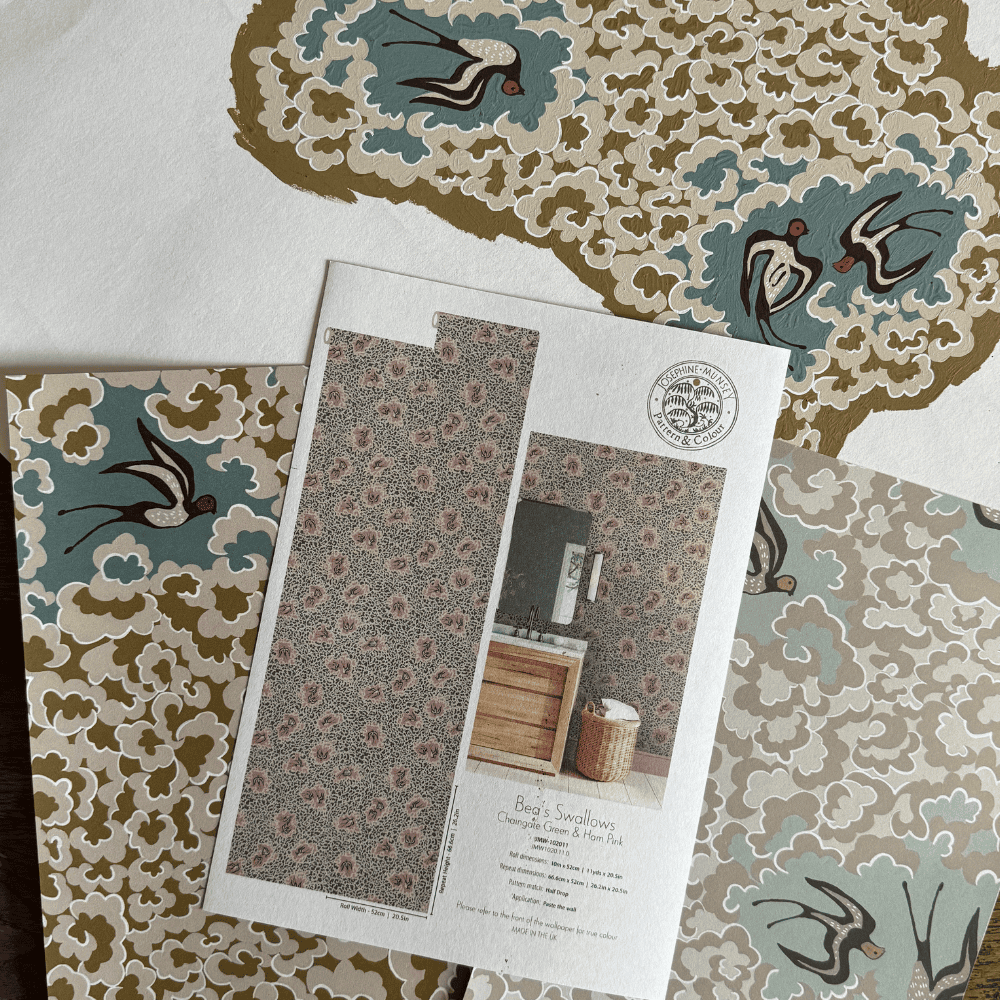 Named after my niece, Bea’s Swallows features hand-painted swallows playing amongst parted clouds. Many painted versions of the birds were explored before the final forms were selected. The clouds were adjusted and softened to allow the swallows to sit naturally within the design. Painted by hand throughout, the wallpaper shares the same colourways as the Clouds design and was created to be used alongside it, allowing for cohesive interiors across walls and ceilings.