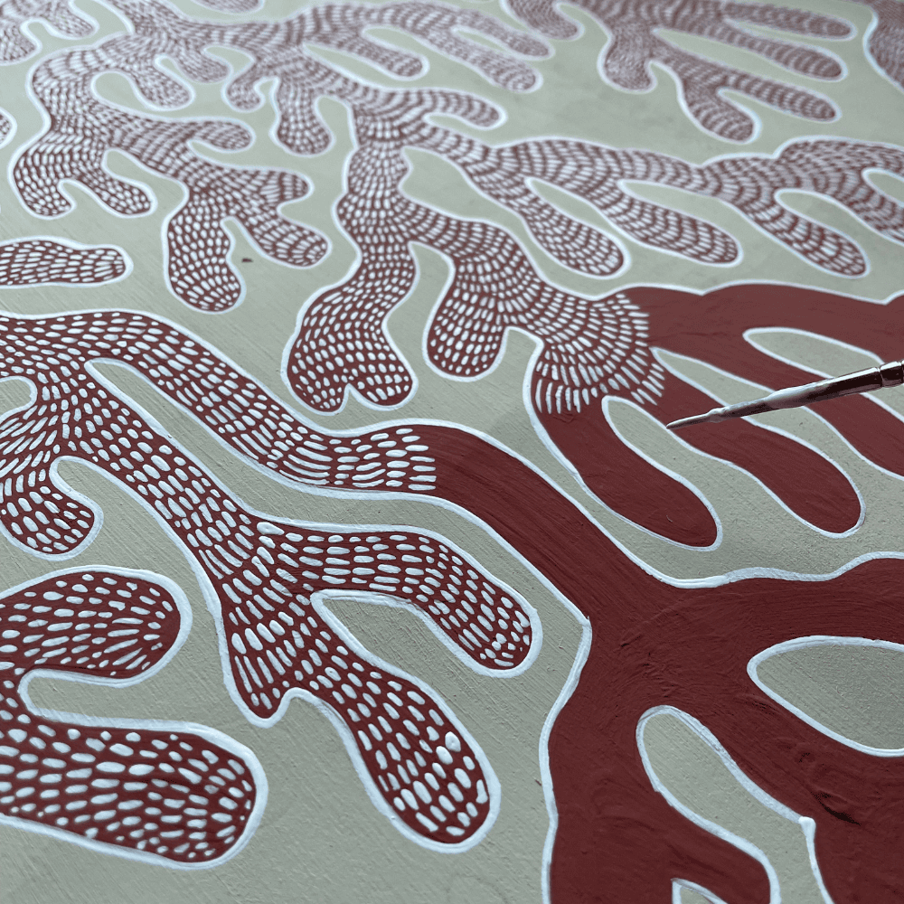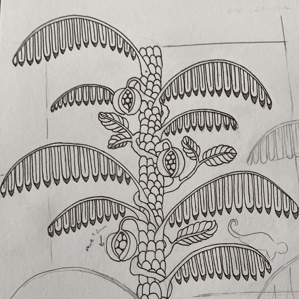 Palm Stripe evolved through extensive hand-drawn and painted experimentation. The design did not begin with a fixed image, but with organic, flowing marks that were refined over time. More than twenty painted versions were produced before the final composition emerged. The leaves were hand painted with subtle gradients to introduce softness and depth to the linear structure. While the final painting was completed relatively quickly, the development of the design reflects many weeks of work and years of sketchbook exploration.