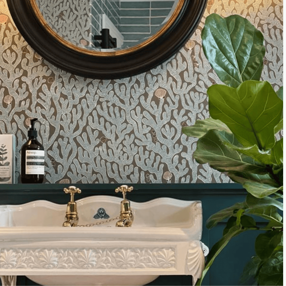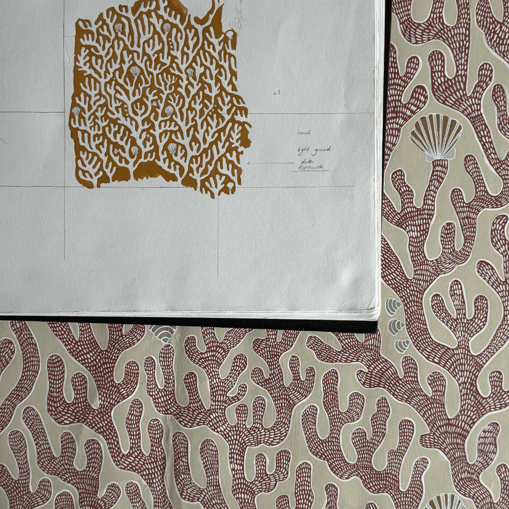 Coral is a hand-painted coral design that balances whimsy with careful observation. Botanical archives, including those of institutions such as the Smithsonian, were used as reference, alongside historic botanical paintings. Texture was created through expressive painted marks to suggest coral surfaces. Shells were painted and positioned in an unusual, playful way. The repeat was carefully painted and adjusted so that no single element dominates, ensuring an even and harmonious surface.